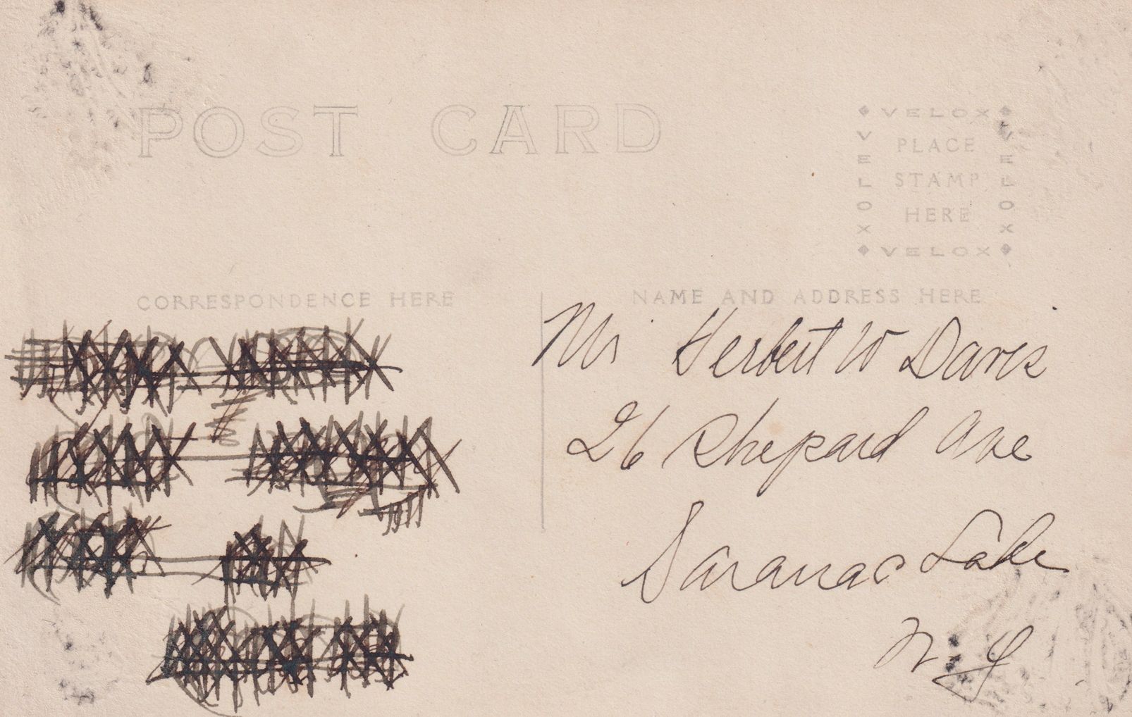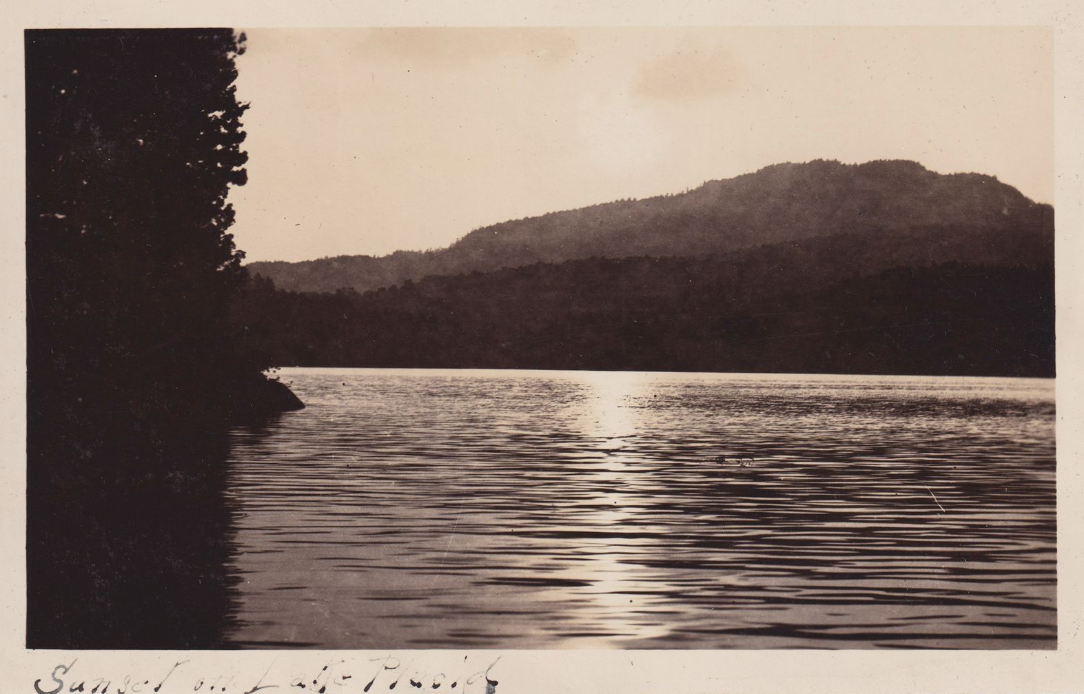 Photo postcard of Lake Placid, likely taken from the shore. Light from the sun can be seen reflecting across the water's surface. The other side of the lake, covered in lots of trees, is visible. "Sunset on Lake Placid" is handwritten in ink beneath the photo. The postcard is addressed to "Mr. Herbert W. Davis 26 Shepard Ave Saranac Lake, NY."