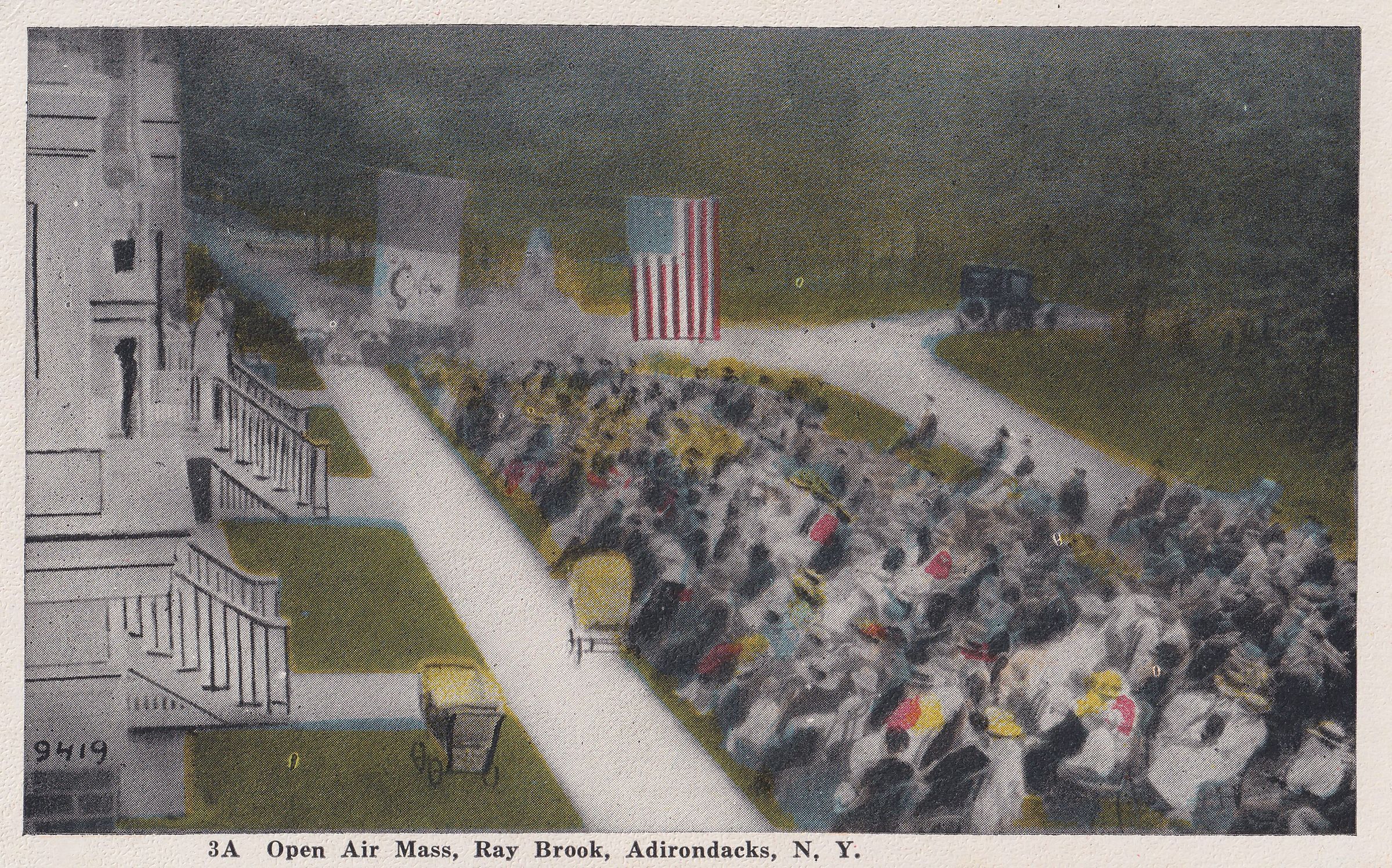 Color postcard showing a large crowd seated on the lawn in front of the main building at the New York State Hospital for Incipient Tuberculosis, AKA Ray Brook Sanatorium. Printed caption on front reads, "Open Air Mass, Ray Brook Adirondacks N.Y." No printer's mark. Unused, divided back, white border.Subject Place