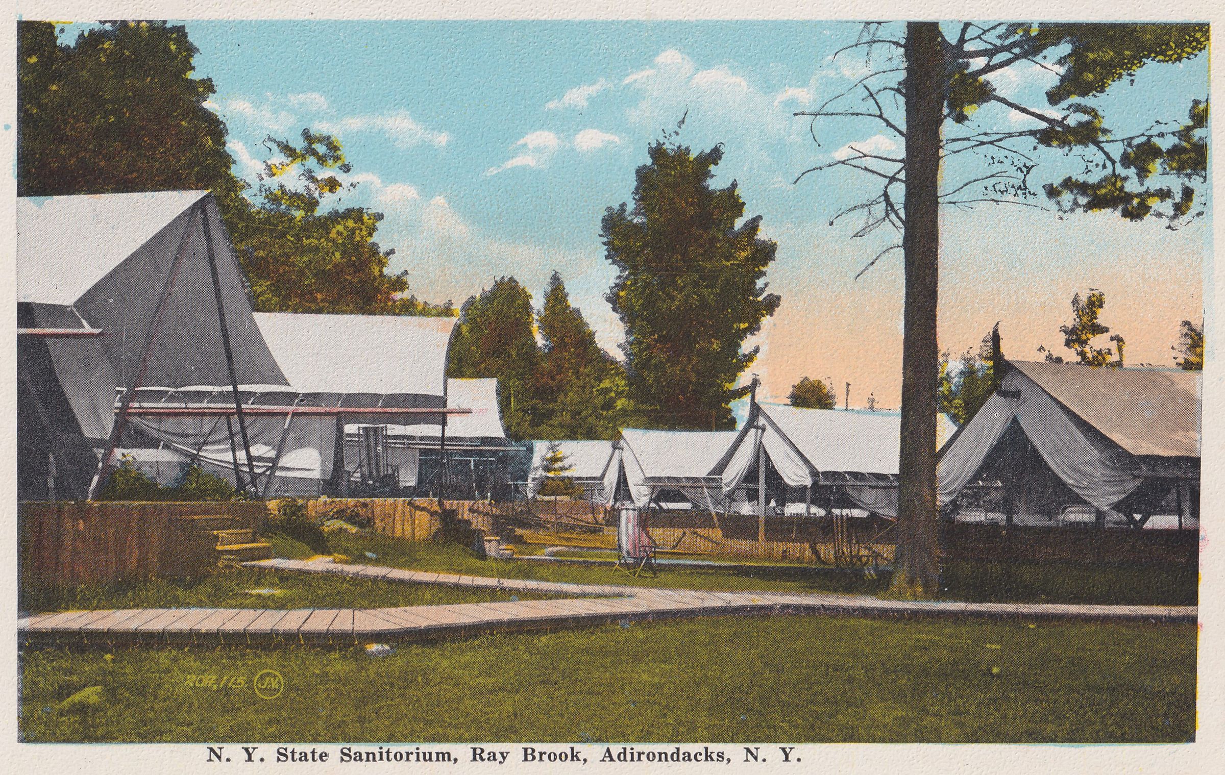 Color postcard showing a group of tent platforms connected by wooden sidewalks. Printed caption on front reads, "N.Y. State Sanitorium, Ray Brook, Adirondacks, N.Y." No printer's mark. Unused, divided back, white border.Subject Place