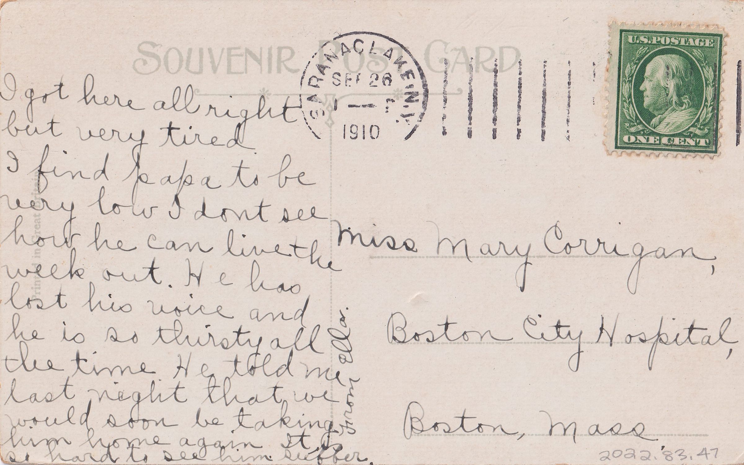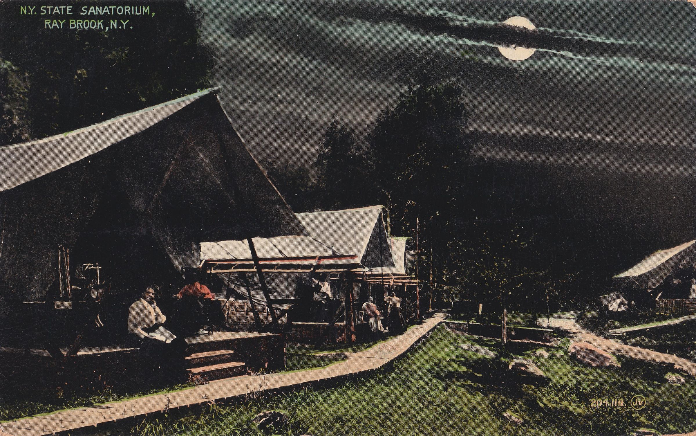 Color postcard showing a group of tent platforms connected by wooden sidewalks at nighttime. The moon is visible in the sky, and several people are seated on the porches of the tents. Printed caption on front reads, "N.Y. State Sanatorium, Ray Brook, N.Y." Printed in Great Britain. Used, divided back, postmarked Saranac Lake, September 26, 1910. Handwritten message on back reads, "I got here all right but very tired. I find papa to be very low I don't see how he can live the week out. He has lost his voice and he is so thirsty all the time. He told me last night that we would soon be taking him home again. It is so hard to see him suffer. From Ella." Mailed to Miss Mary Corrigan. Boston City Hospital. Boston, Mass.Subject Place