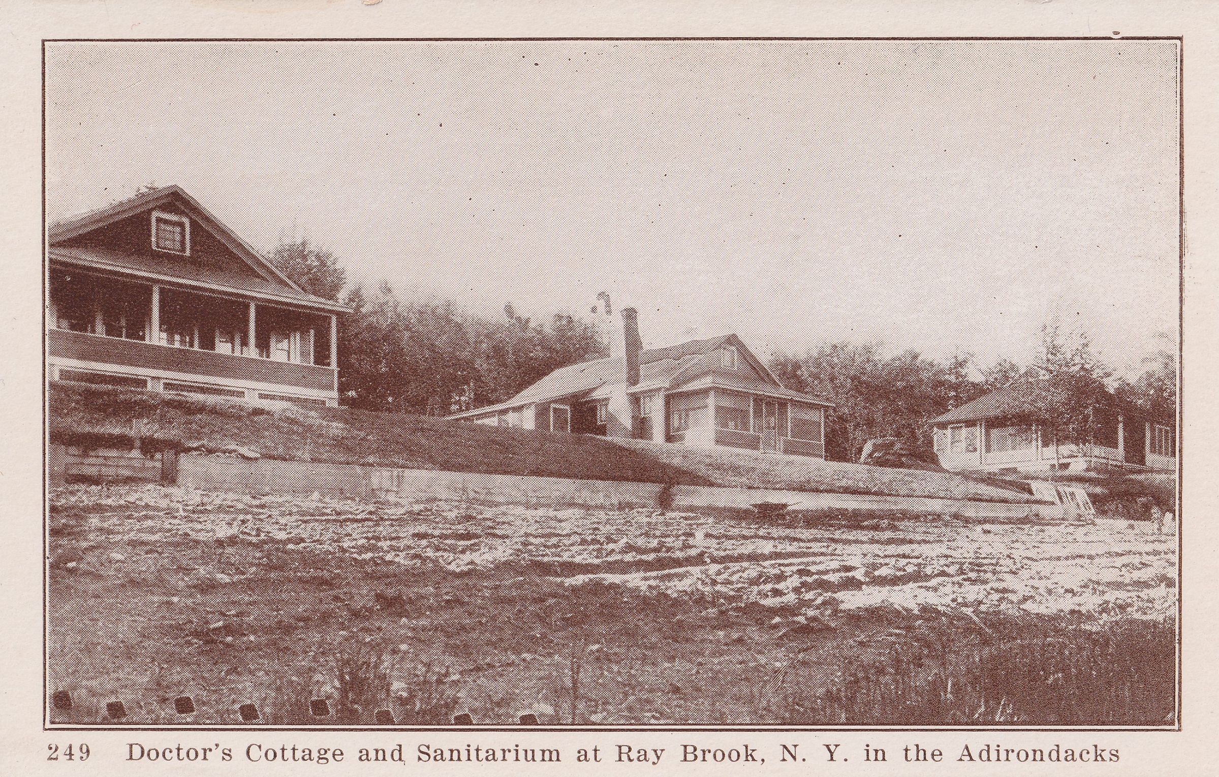 Sepia-toned postcard showing several small cottages at the New York State Hospital for Incipient Tuberculosis, AKA Ray Brook Sanatorium. Printed caption on front reads, "Doctor's Cottage and Sanitarium at Ray Brook, N.Y. in the Adirondacks." Printed by the Greeting Card Mfg. Co., Inc., New York. Unused, divided back, white border.Subject Place