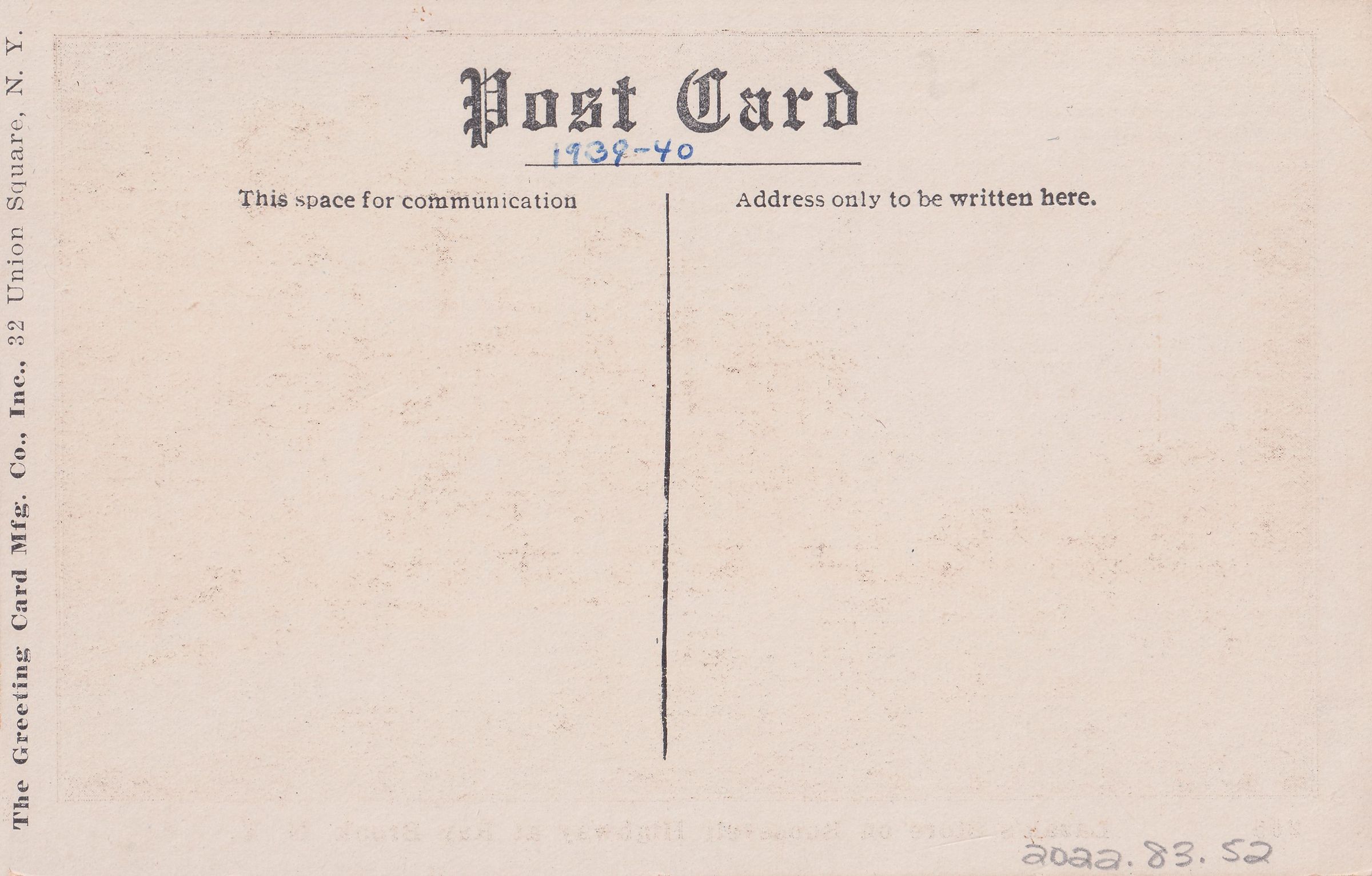 Sepia-toned postcard showing a store building with a gas pump in front. Printed caption on front reads, "Lazak's Store on Roosevelt Highway at Ray Brook, N.Y." [Note: the name is incorrect, the store was owned by the Lezak Family.] Printed by the Greeting ard Mfg. Co., Inc., New York. Unused, divided back, white border. Handwritten note on the back reads, "1939-40."Subject Place