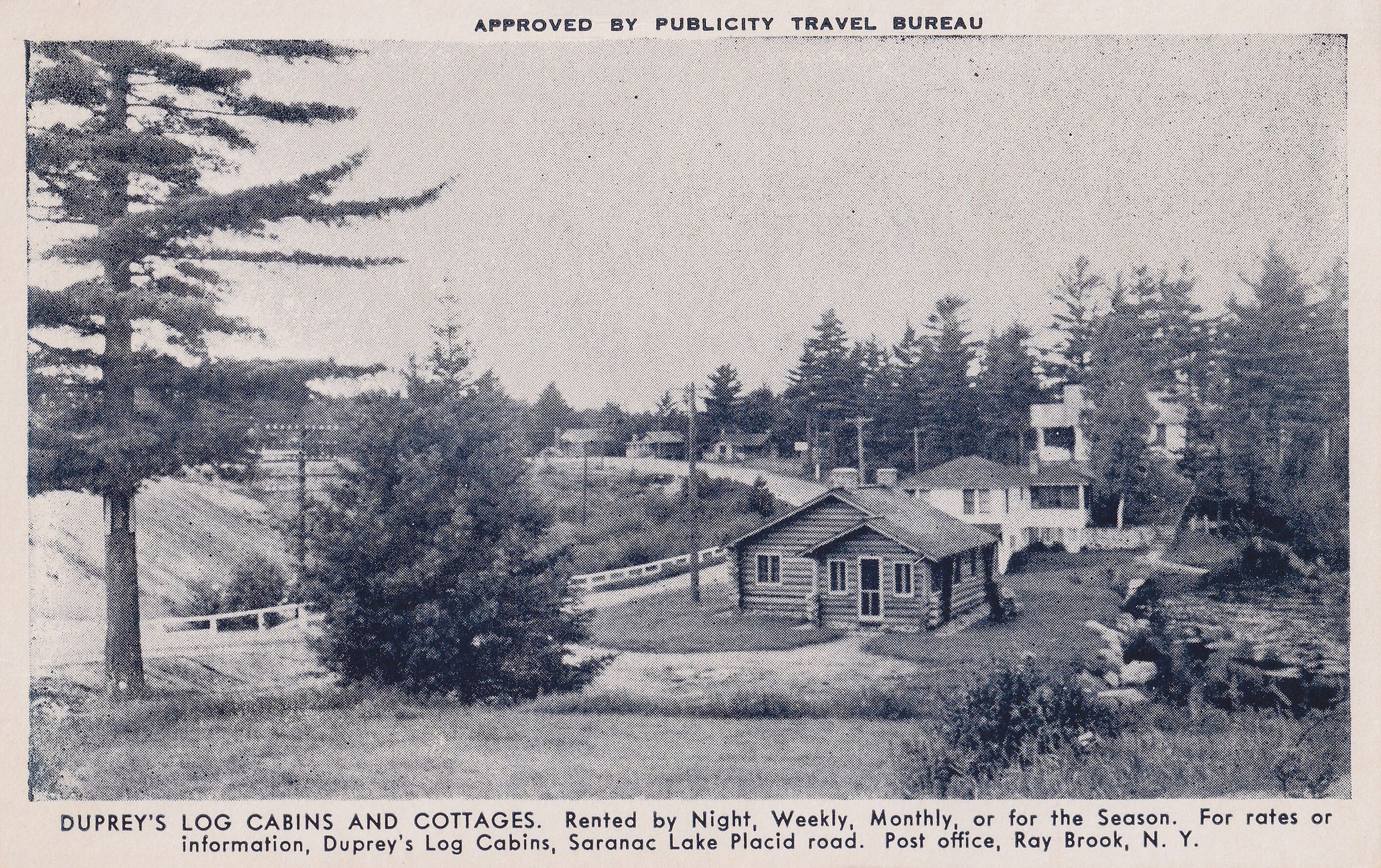 Black and white postcard showing a log cabin style building along a road with other buildings visible behind. Printed caption on front reads, "Duprey's Log Cabins and Cottages." Printed by Publicity Travel Bureau, Oswego, NY. Unused, divided back, white border. Handwritten note on back reads, "1945."Subject Place