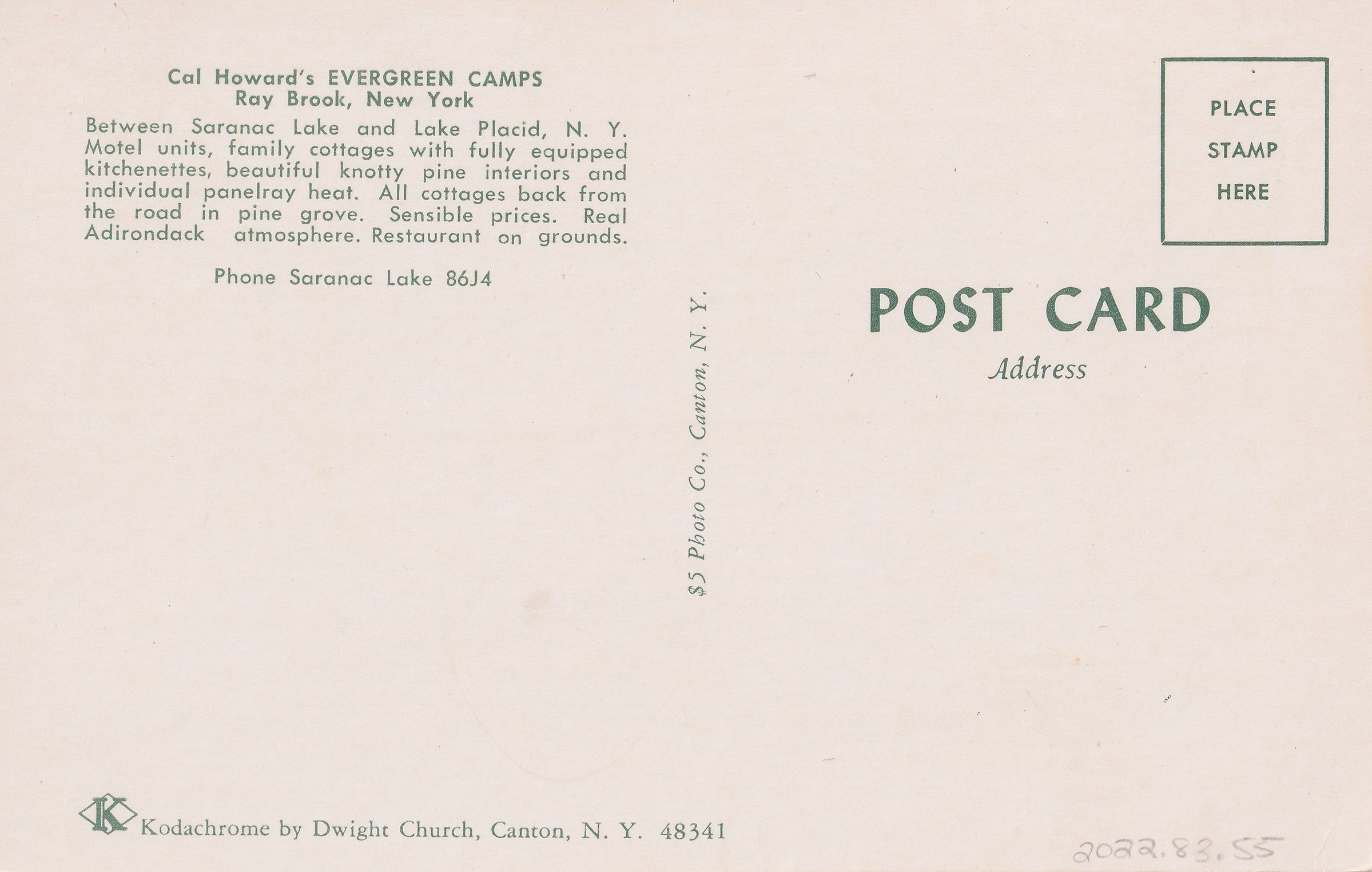 Color postcard showing several small cabins along a driveway. Printed caption on back reads, "Cal Howard's Evergreen Camps, Ray Brook, New York." Printed by the $5 Photo Co., Canton, NY. Unused, divided back.Subject Place