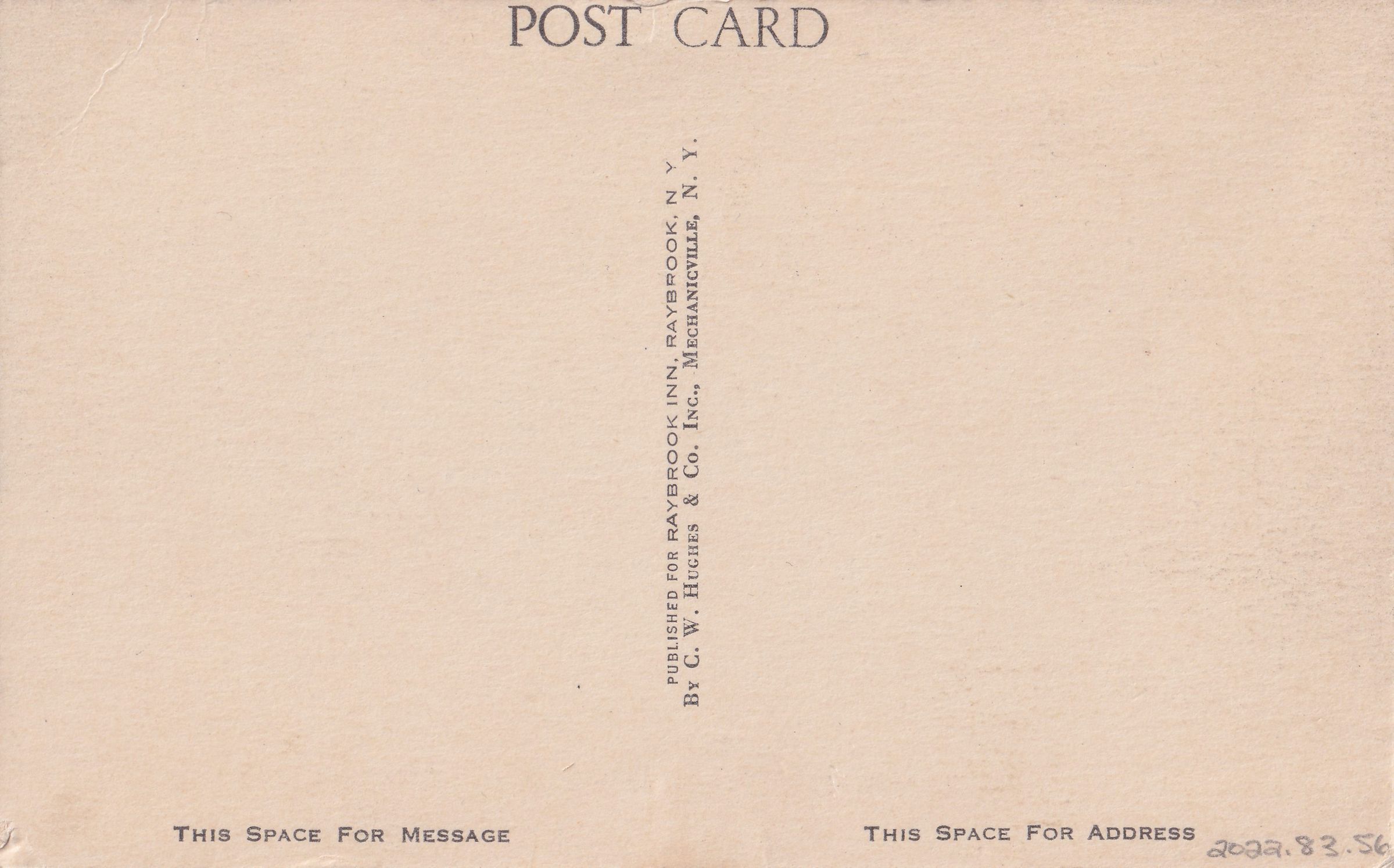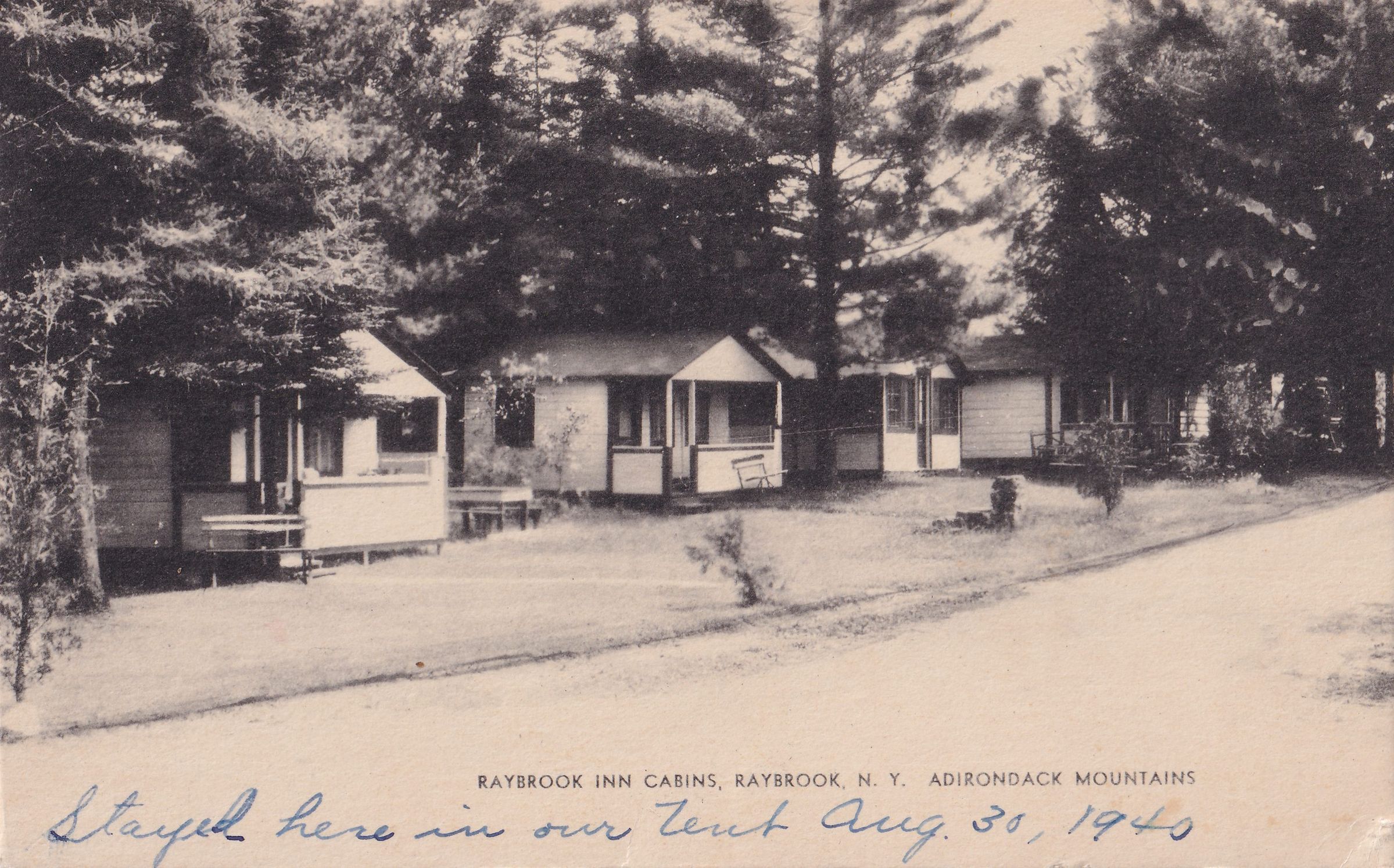 Black and white postcard showing several small cabins. Printed caption on front reads, "Raybrook Inn Cabins, Raybrook, N.Y. Adirondack Mountains." Printed by the C. W. Hughes & Co., Inc., Mechanicville, NY. Used, divided back, not postally mailed. Handwritten note on front reads, "Stayed here in our tent Aug. 30, 1940."Subject Place