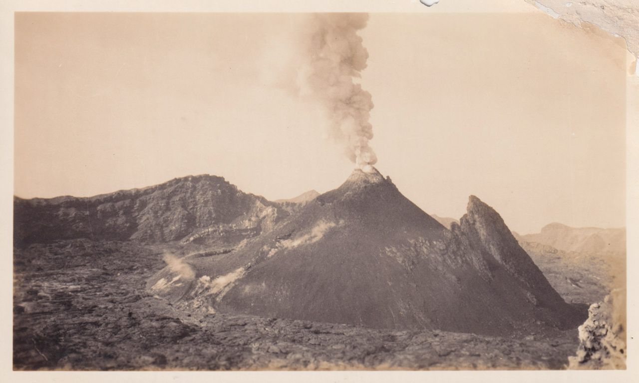 Black-and-White photograph of a volcano crater. Smoke can be seen coming from the volcano. The photograph was likely taken by a person on vacation in Italy and printed by Kollecker's Kodak and Gift Shop.