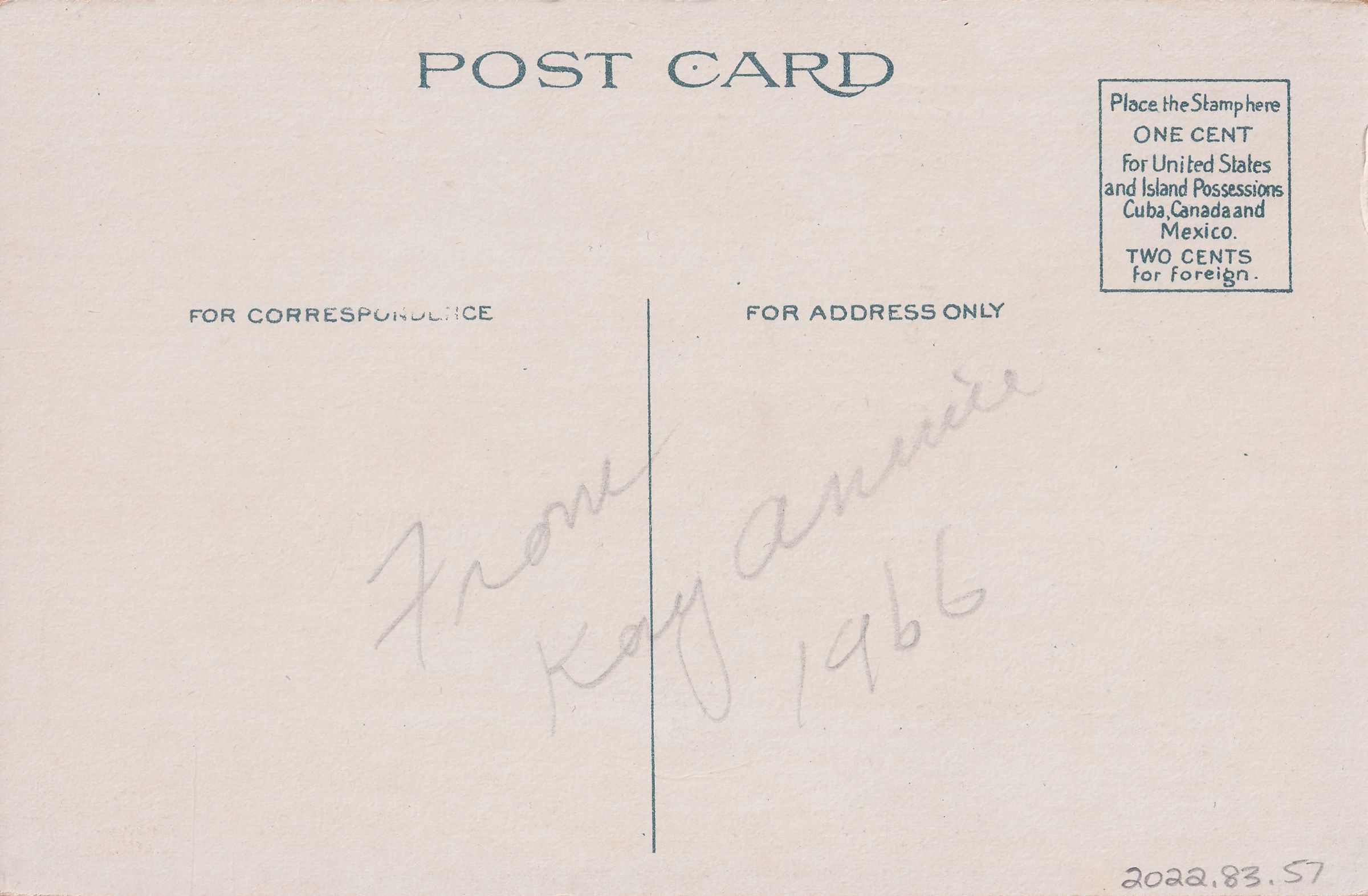 Color postcard showing a crowd of people along a train platform as a train pulls into the station. Printed caption on front reads, "The D & H & N.Y. Central Station, Raybrook, N.Y." No printer's mark. Used, divided back, white border, not postally mailed. Handwritten note across back reads, "From Kay Annice [?] 1966."Subject Place