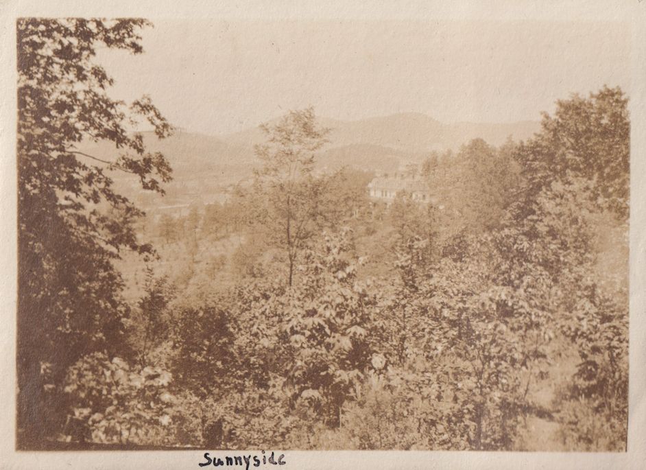 Black-and-white photograph taken from a mountain or similar high elevation, most likely near Asheville, North Carolina. There are many trees between the photographer and a house or other type of building in the distance, with mountains farther in the background. "Sunnyside" is written in ink beneath the photograph.