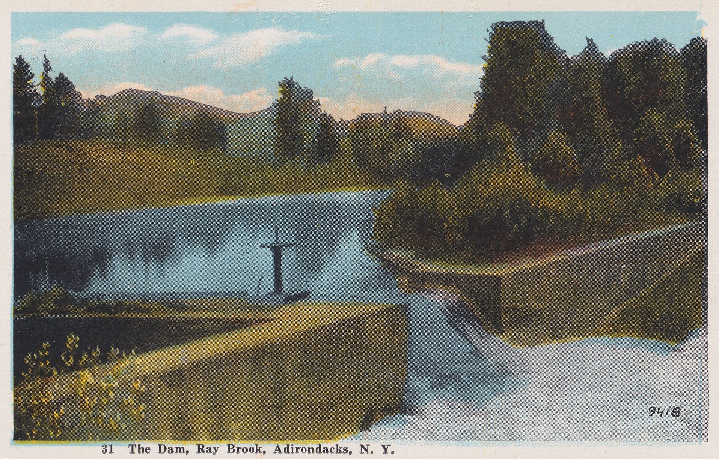 Color postcard showing water running over a dam. Printed caption on front reads, "The Dam, Ray Brook, Adirondacks, N.Y." No printer's mark. Unused, divided back, white border.Subject Place