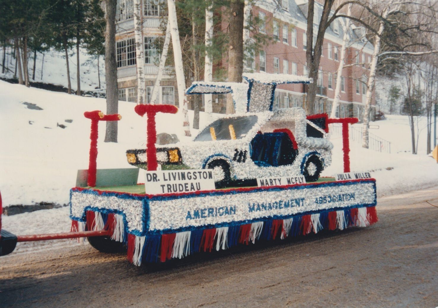 Color photograph of a Winter Carnival float being towed on a road. The float looks like the DeLorean time machine from the film Back to the Future. "American Management Association" is written on the base of the float, with "Dr. Livingston Trudeau," "Marty McFly," and "Julia Miller" on smaller white pieces of material in front of the car. This photograph is from an album of photographs taken by staff of the American Management Association.