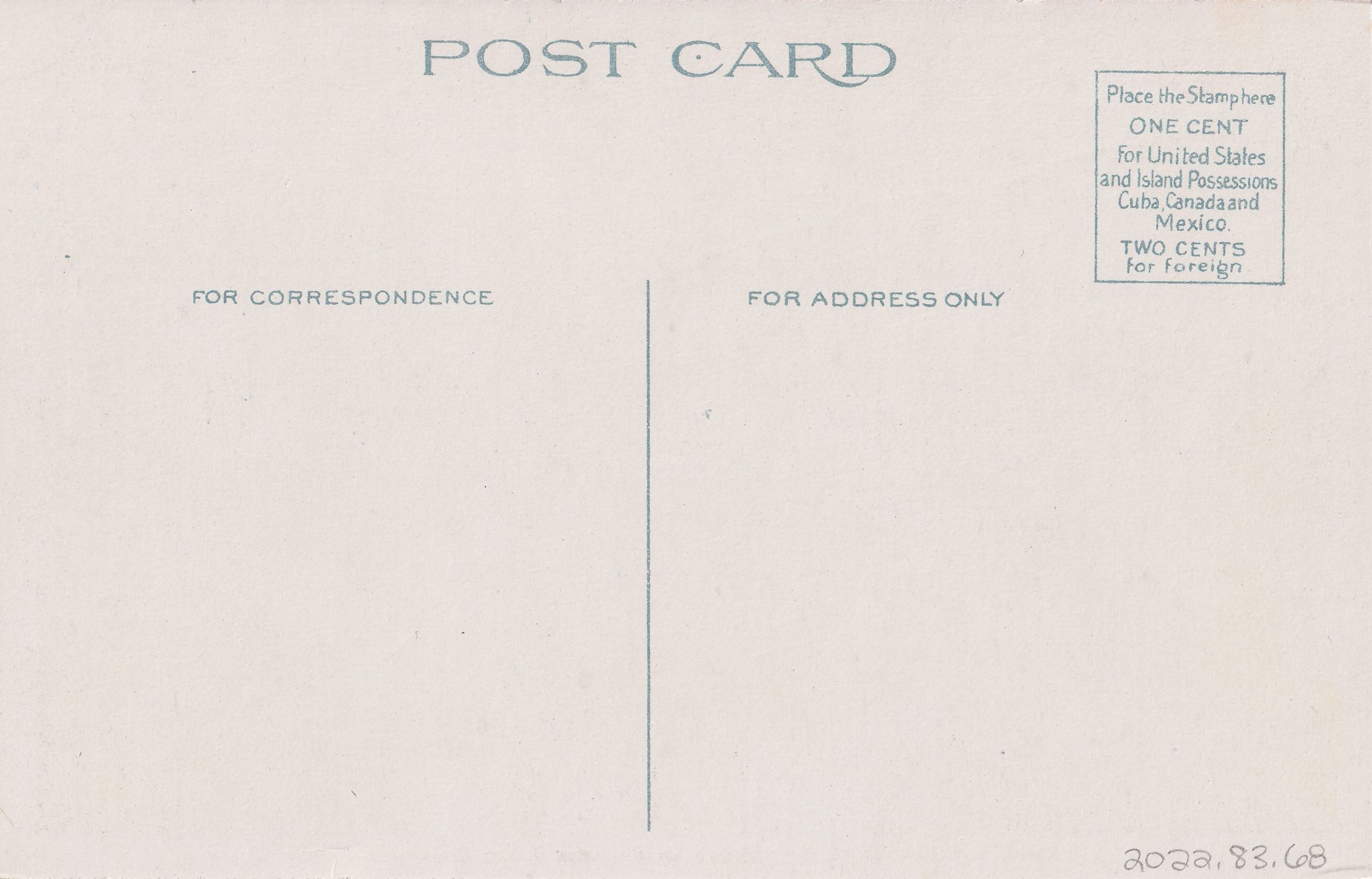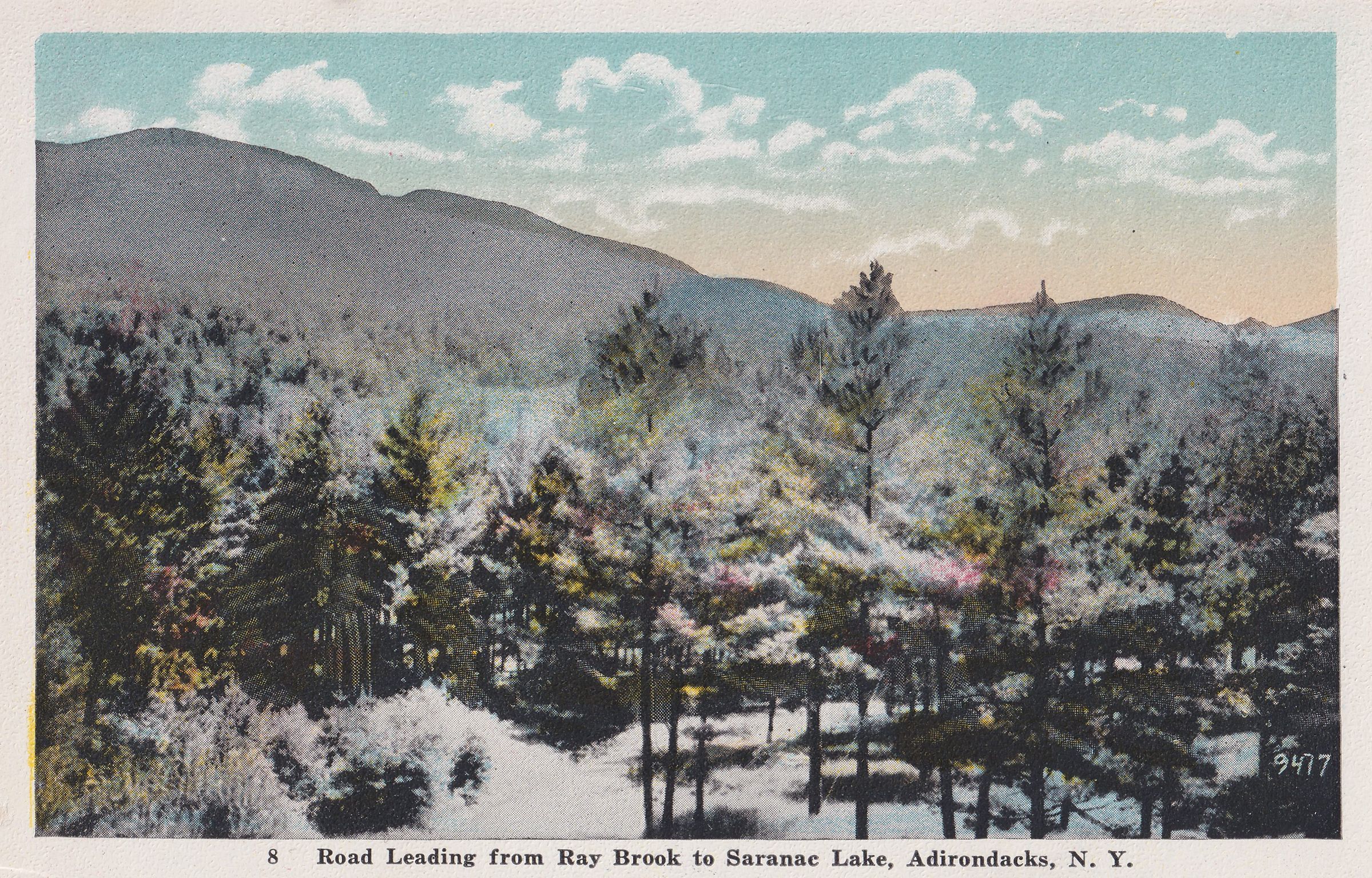 Color postcard showing a scene of snowy trees. Printed caption on front reads, "Road Leading from Ray Brook to Saranac Lake, Adirondacks, N.Y." No printer's mark. Unused, divided back, white border.Subject Place