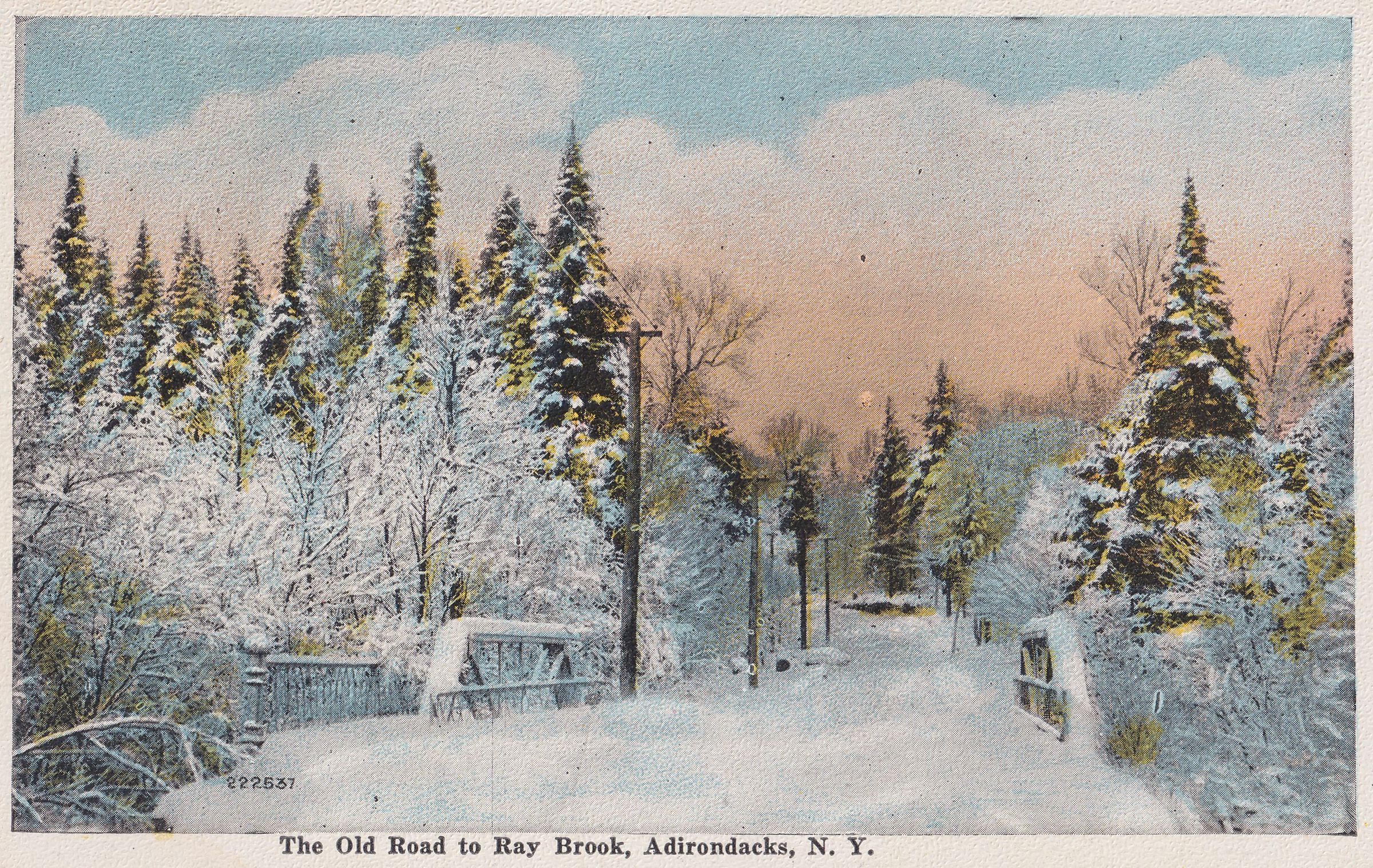 Color postcard showing a snowy road and bridge through the woods. Printed caption on front reads, "The Old Road to Ray Brook, Adirondacks, N.Y." No printer's mark. Unused, divided back, white border.Subject Place