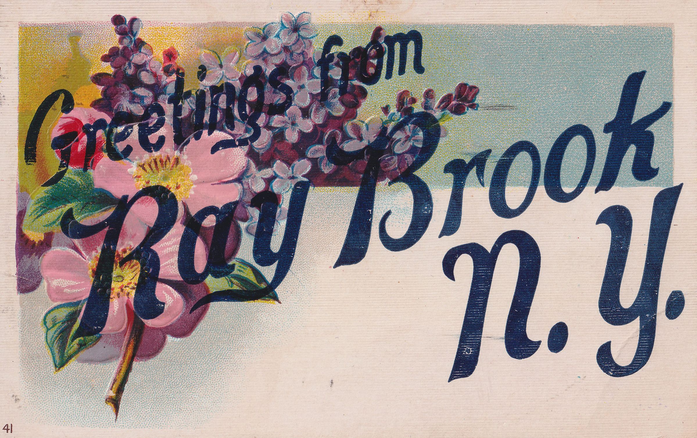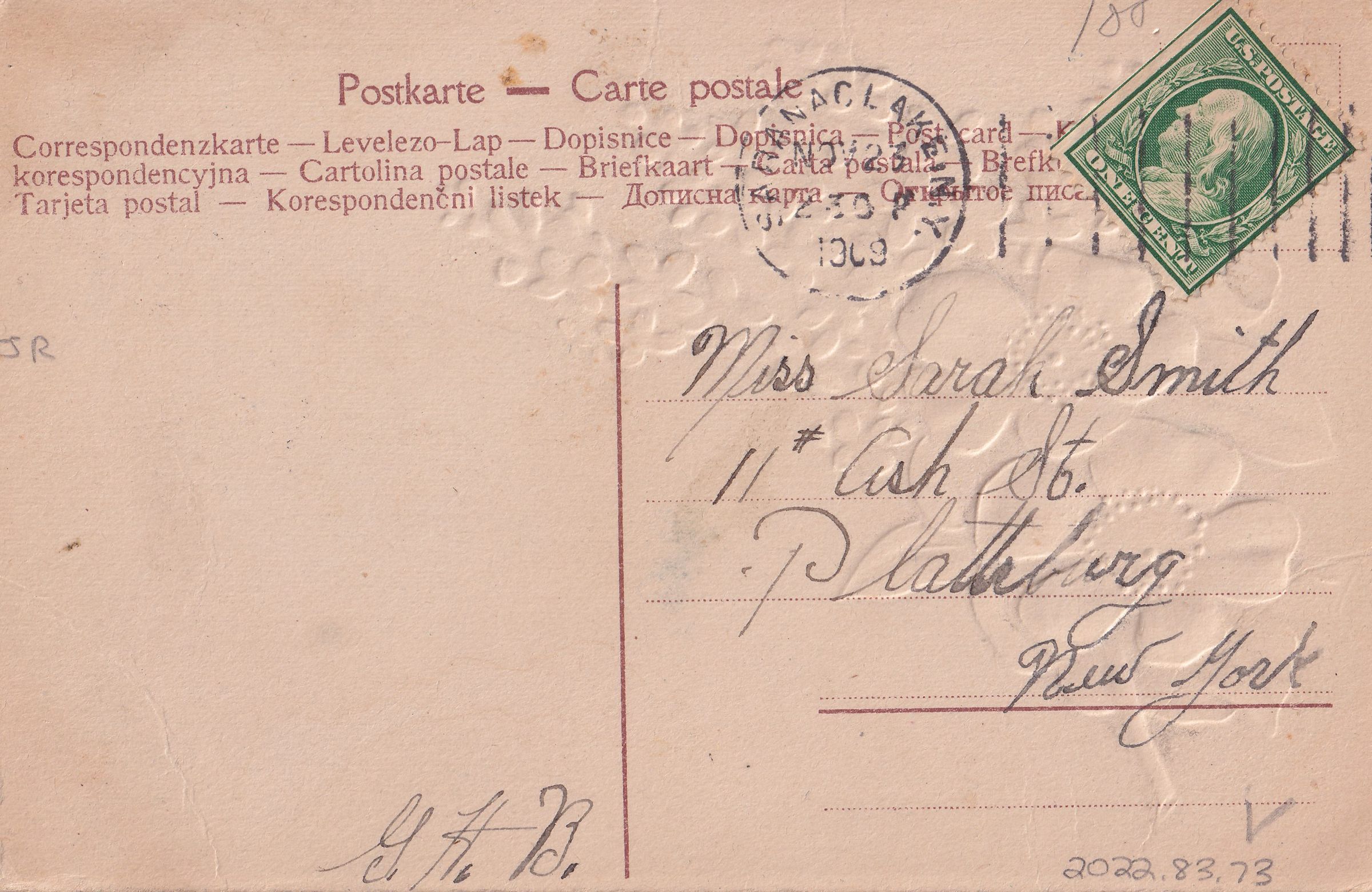 Color postcard with embossed floral illustration. Printed caption on front reads, "Greetings from Ray Brook. N.Y." No printer's mark. Used, divided back, postmarked Saranac Lake, NY, November 23, 1909. Handwritten note on back reads, "G. H. B." Mailed to Miss Sarah Smith. 11# Ash St. Plattsburg. New York.Collection