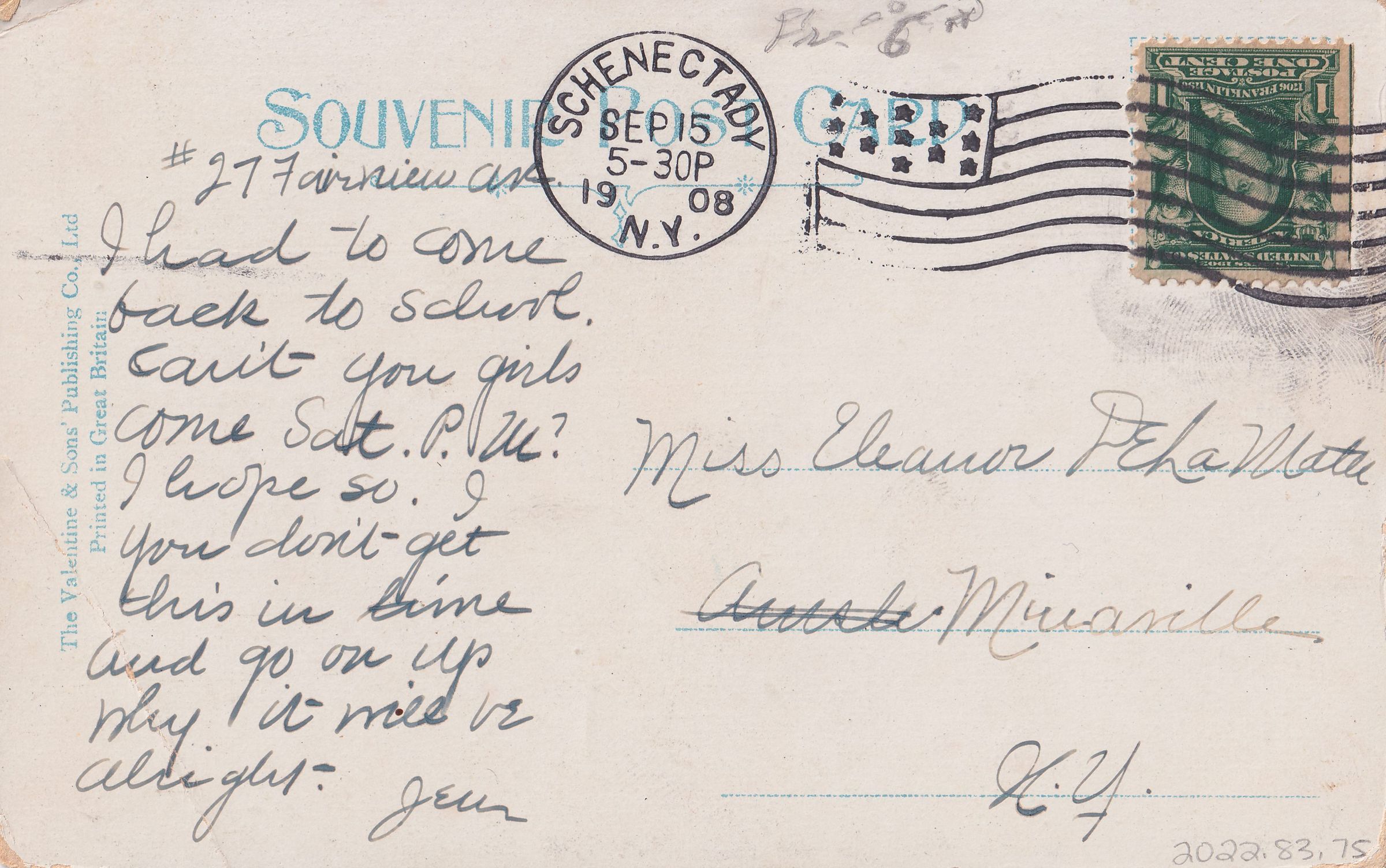 Color postcard showing a view of a large hotel campus across a body of water. Printed caption on front reads, "Riverside Inn from River, Saranac Lake, N.Y." Printed by the Valentine & Sons' Publishing Co., Ltd., Great Britain. Used, divided back, postmarked Schenectady, NY, September 15, 1908. Handwritten message on back reads, "# 27 Fairview Ave. I had to come back to school. Can't you girls come Sat. P.M.? I hope so. I you don't get this in time and go on up why it will be alright. Jenn." Mailed to Miss Eleanor De La Motte. Miraville. N.Y.Subject Place