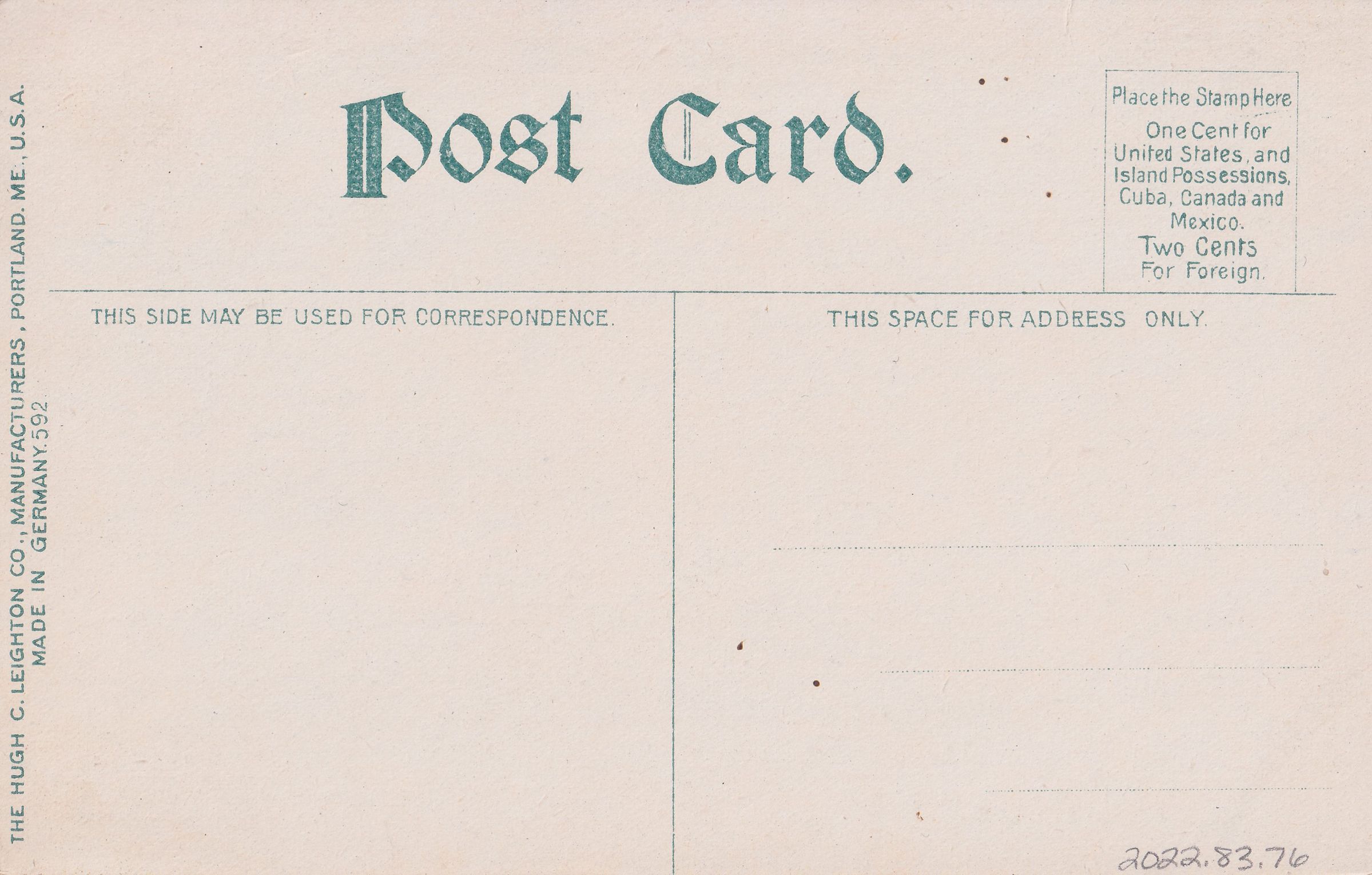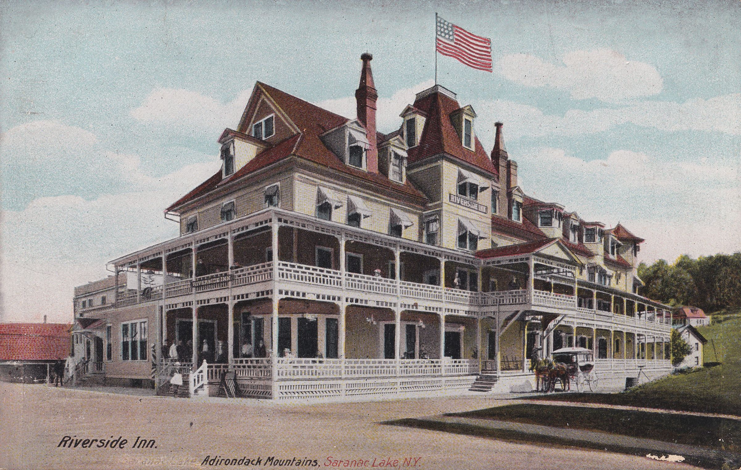 Color postcard showing a large hotel with a horse-drawn coach parked alongside it. Printed caption on front reads, "Riverside Inn, Adirondack Mountains, Saranac Lake, NY." Printed by the Hugh C. Leighton Co., Portland, ME. Unused, divided back.Subject Place