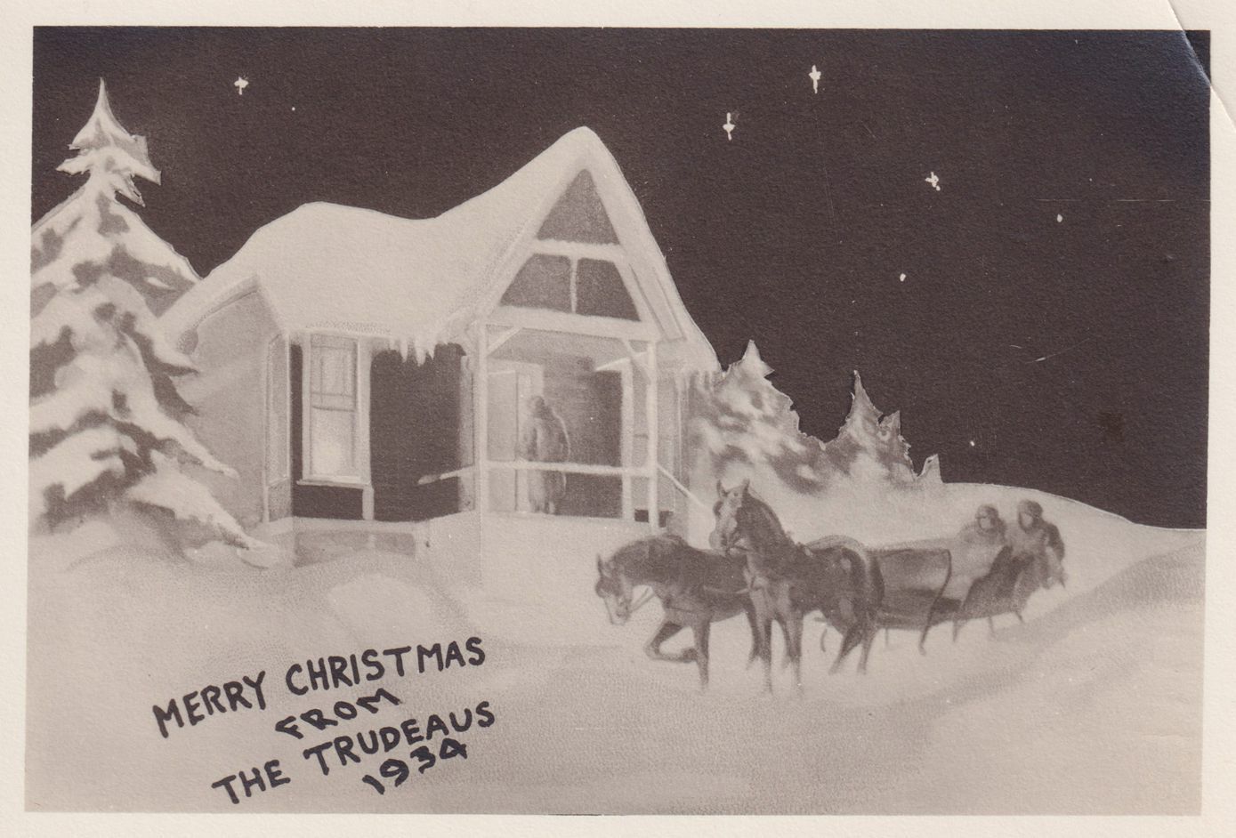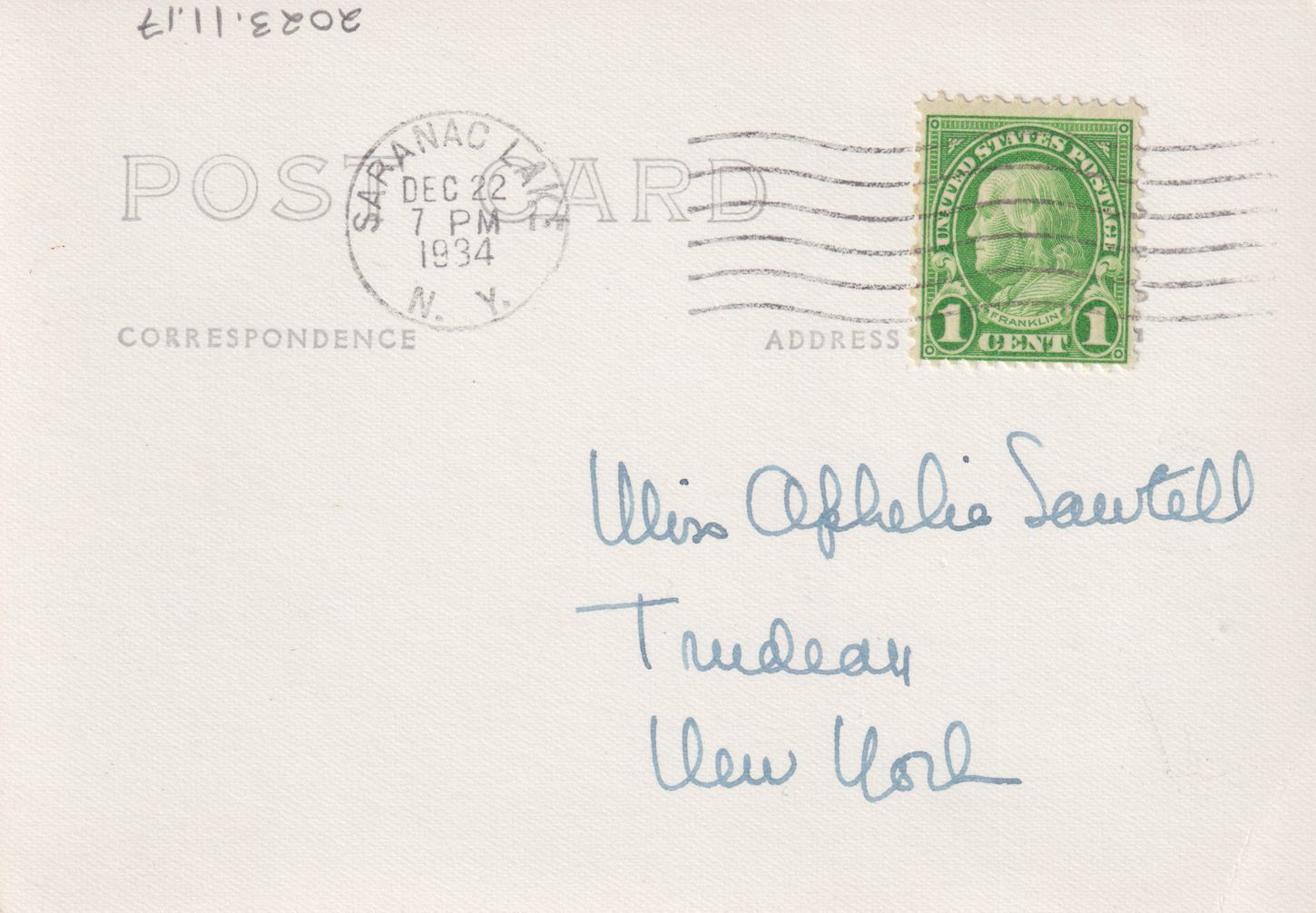Trudeau Family Christmas card, 1934. Features drawing of Little Red in the snow, with a horse-drawn sleigh out front. A person in a fur coat can be seen on the porch. Reads, “Merry Christmas from the Trudeaus, 1934,” on front. [Note: this design mimics the Christmas Seal featuring Little Red released the same year in honor of the 50th Anniversary of Trudeau Sanatorium.] Mailed to Miss Ophelia Sawtell, Trudeau, New York.Subject Place
