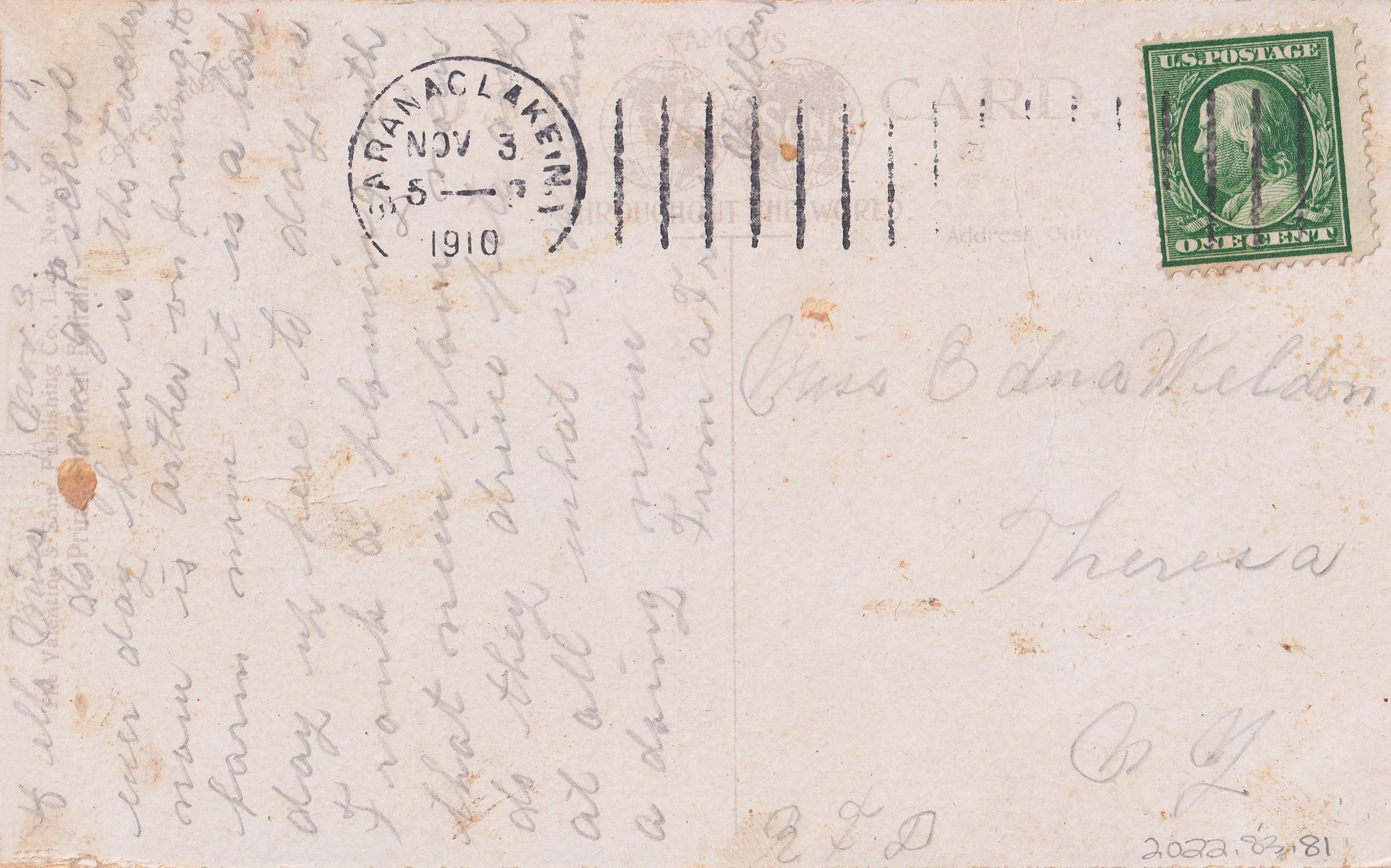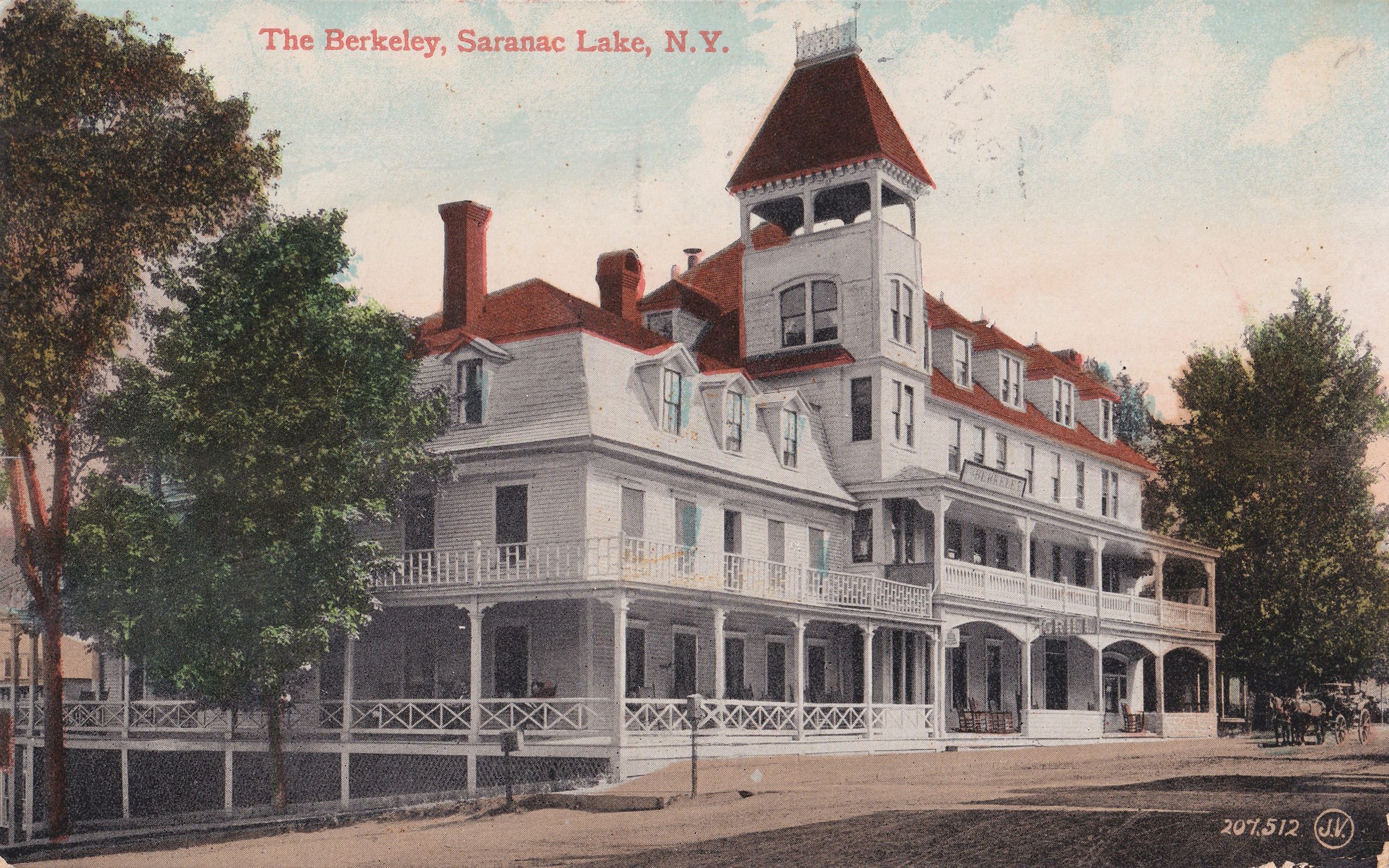 Color postcard showing the Berkeley House prior to the 1925 fire. Printed caption on front reads, "The Berkeley, Saranac Lake, N.Y." Printed by the Valentine & Sons' Publishing Co., Ltd., New York. Used, divided back, postmarked Saranac Lake, November 3, 1910. Handwritten message on back reads, "Nov. 3, 1910. Hello Miss, Do you go to school every day. How is the teacher. Name is Arther [?] to farm where it is a bad day up here to day is. Frank ar plowing with that new plow now. Do they drive [?] any at all. What is [?] a doing now. From a friend Wilbur." Mailed to Miss Edna Weldon, Theresa, N.Y. R.F.D.Subject Place