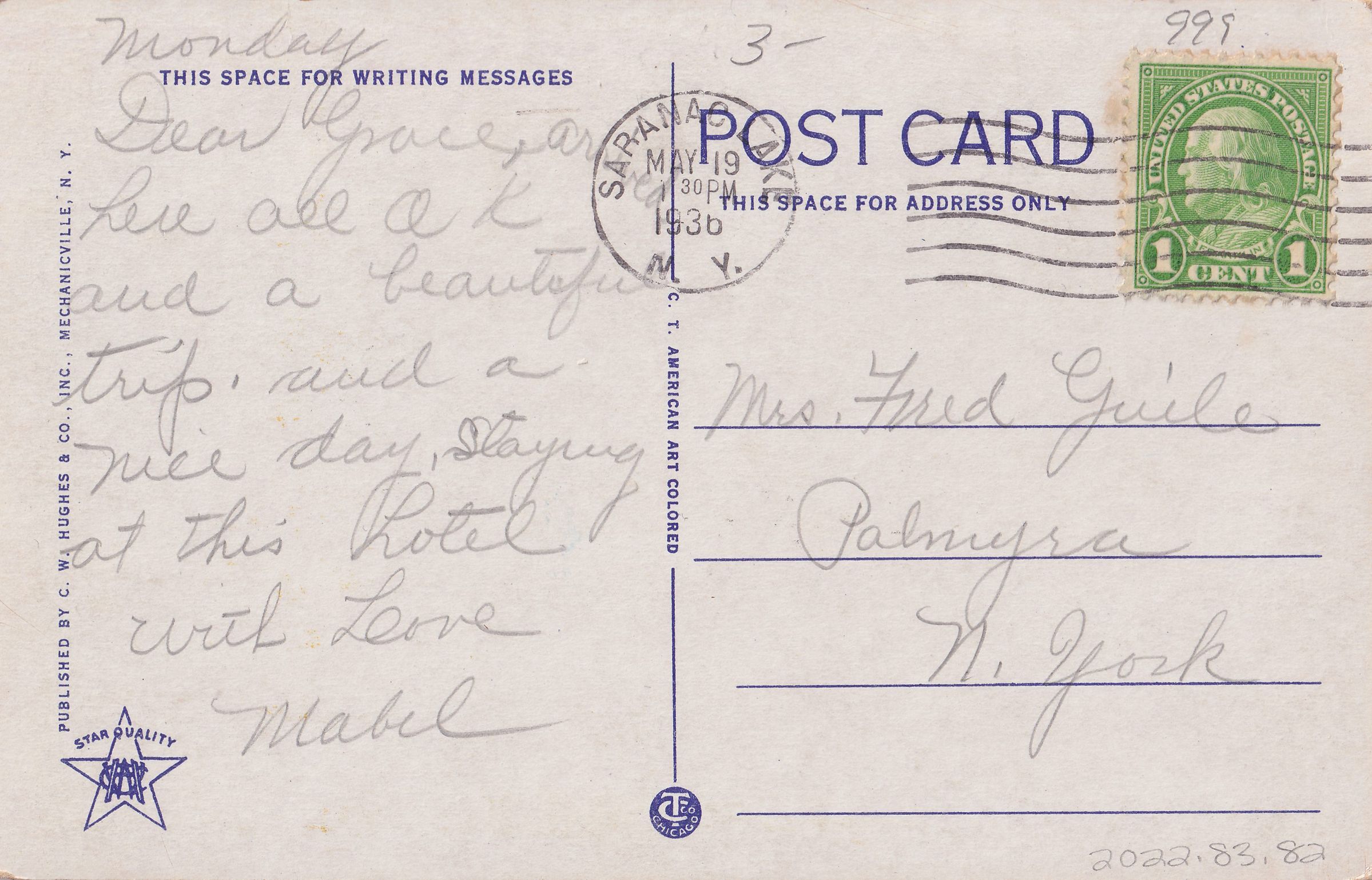 Color postcard showing the Alpine Hotel. Printed caption on front reads, "Hotel Alpine, Saranac Lake, N.Y." Printed by the C. W. Hughes & Co., Inc., Mechanicville, NY. Used, divided back, white border, postmarked Saranac Lake, May 19, 1936. Handwritten message on back reads, "Monday. Dear Grace, arrived here all O.K. and a beautiful trip. and a nice day. Staying at this hotel. With Love, Mabel." Mailed to Mrs. Fred Guile. Palmyra. N. York.Subject Place