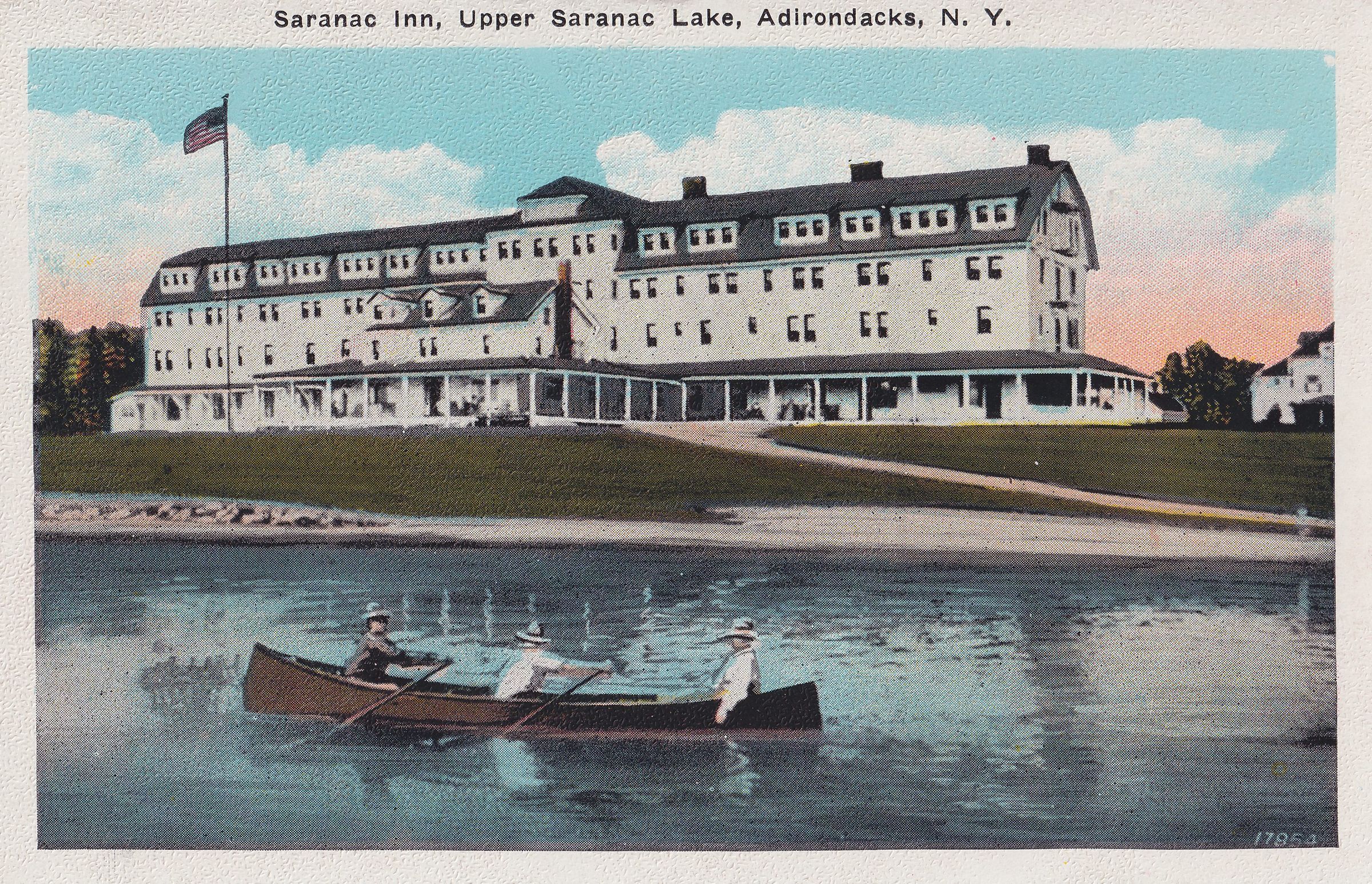 Color postcard showing the Saranac Inn with people rowing a guideboat on the water in front. Printed caption on front reads, "Saranac Inn, Upper Saranac Lake, Adirondacks, N.Y." Printed by Wm. Jubb Co., Inc., Syracuse, NY. Unused, divided back, white border.Subject Place