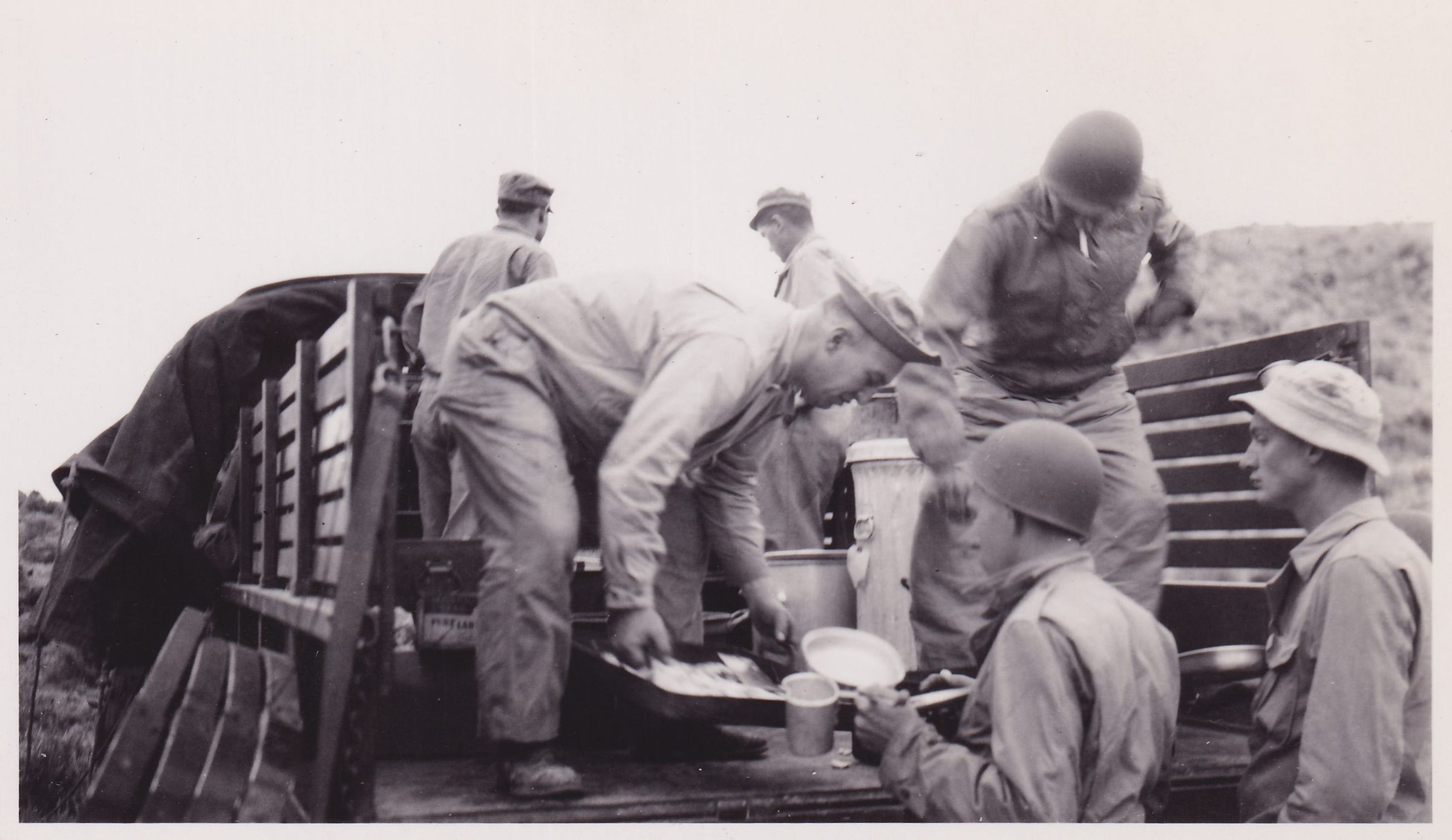 Black-and-White photograph of soldiers serving food from the back of a truck. Handwritten caption on back reads, "Mess Truck."