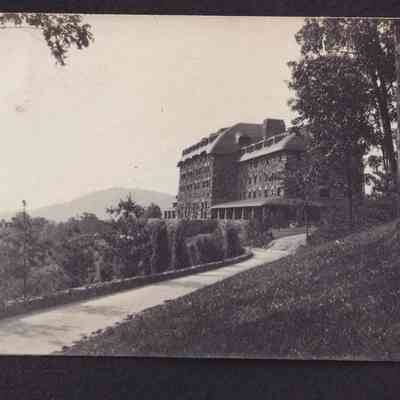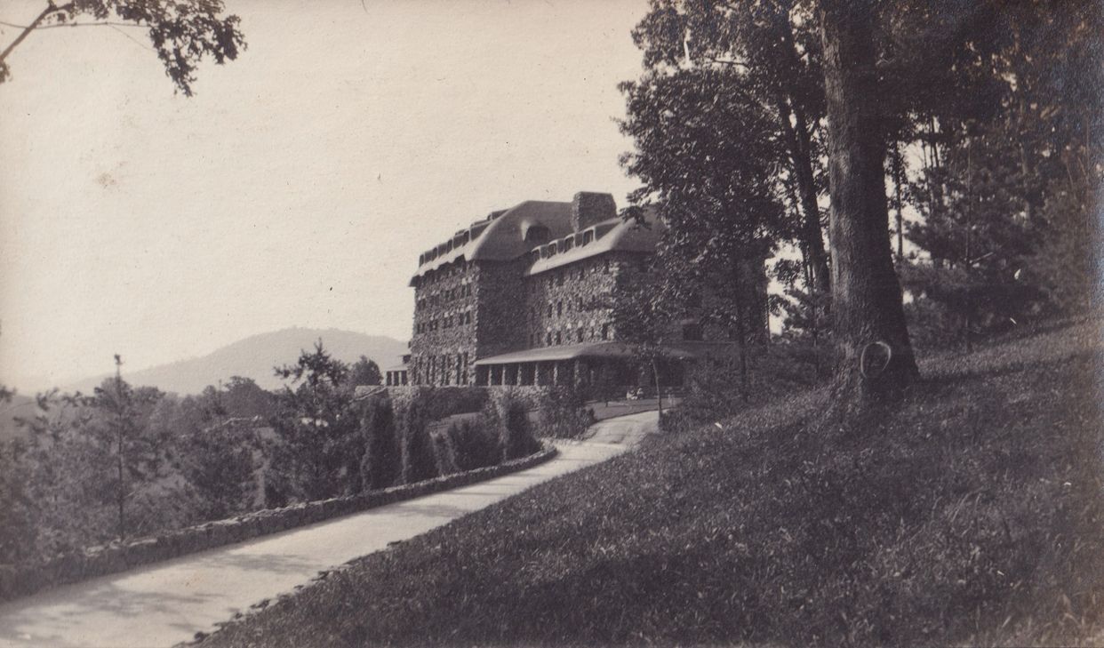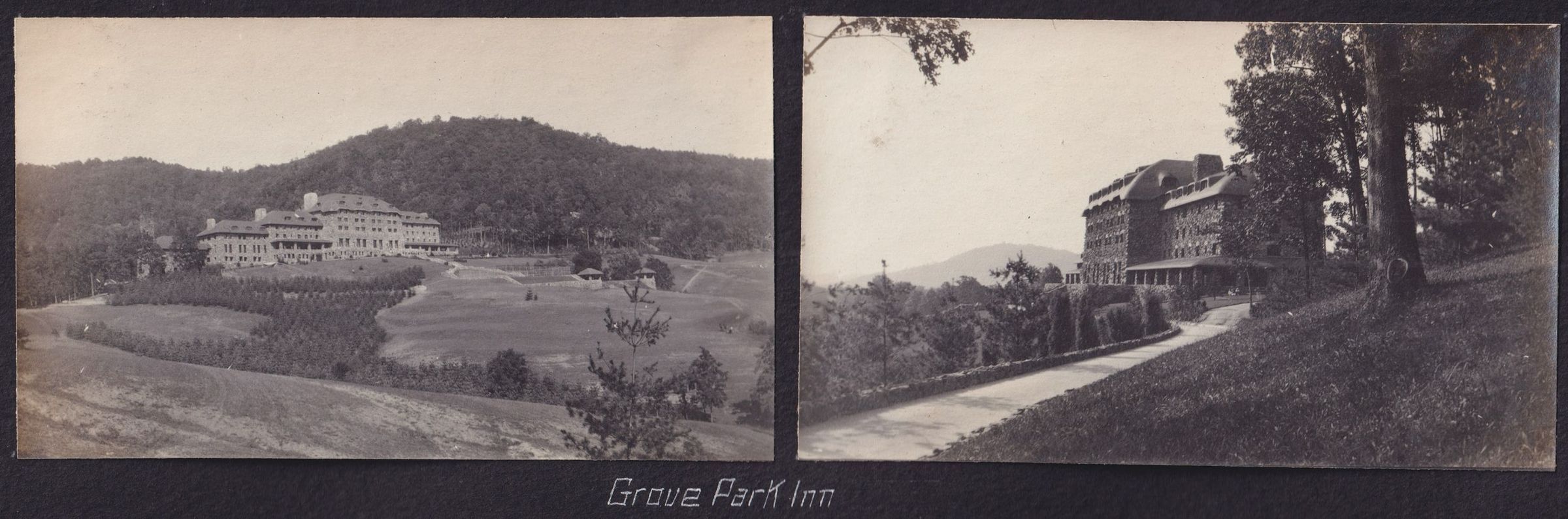 Black-and-white photograph of the Grove Park Inn in Asheville, North Carolina, taken from the road leading up to the hotel on the side. "Grove Park Inn" is written under the photograph in white ink.
