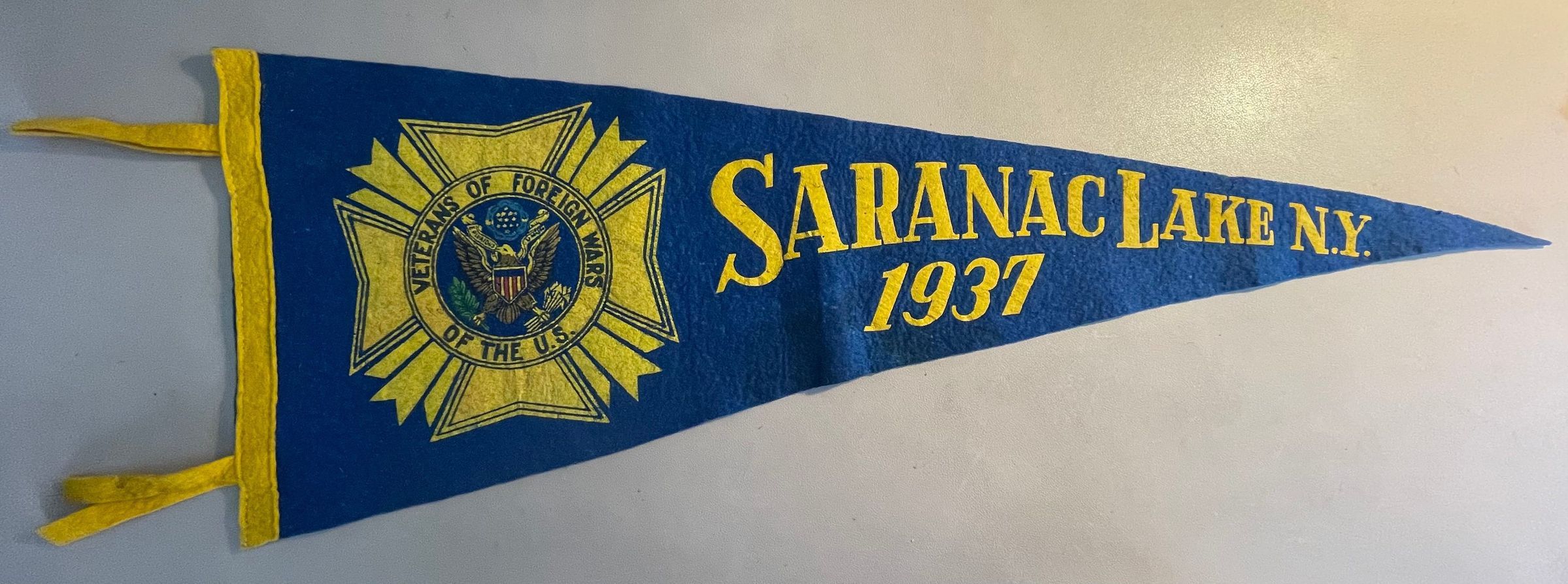 Blue felt pennant with golden yellow top edging and ties. The pennant reads, "Saranac Lake N.Y., 1937," accompanied with a large Veterans of Foreign Wars of the U.S. logo.