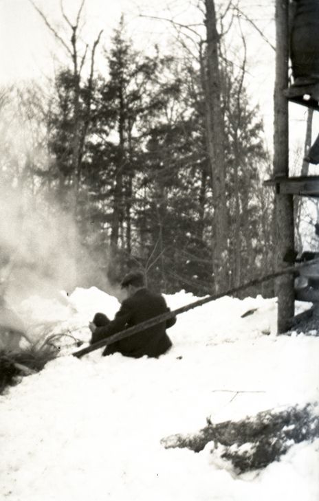 Negative of an unidentified man sitting in snow behind a wooden structure. There is steam or smoke billowing around him. Most likely taken by Mary Ives Baldwin. This item is not fully cataloged but has been uploaded so the image is publicly available; if you would like us to prioritize cataloging this item, please contact the HSL Collections team.