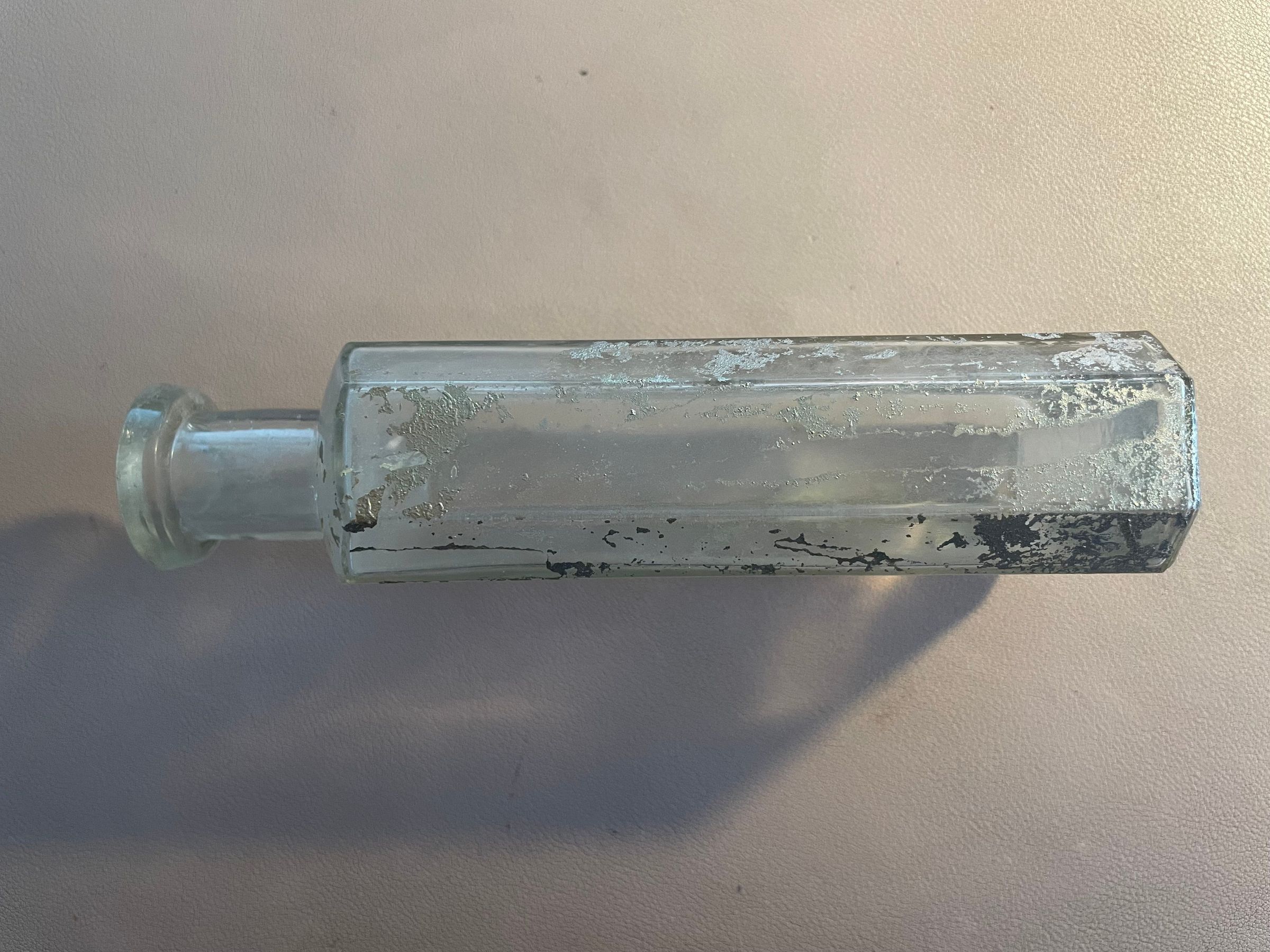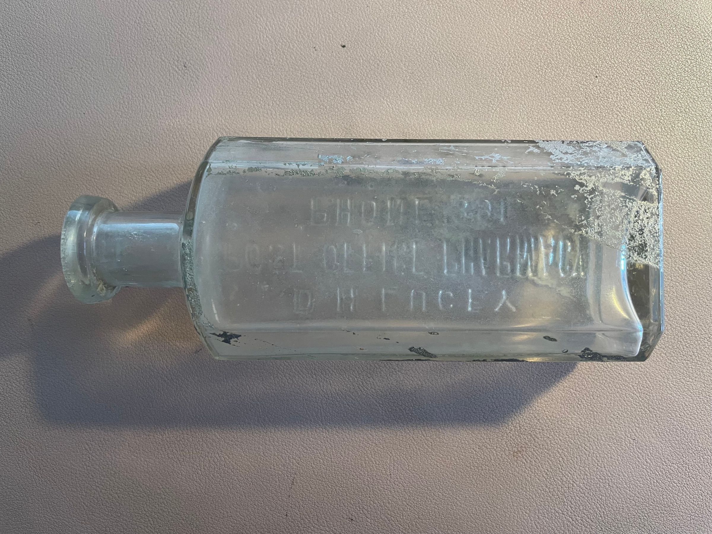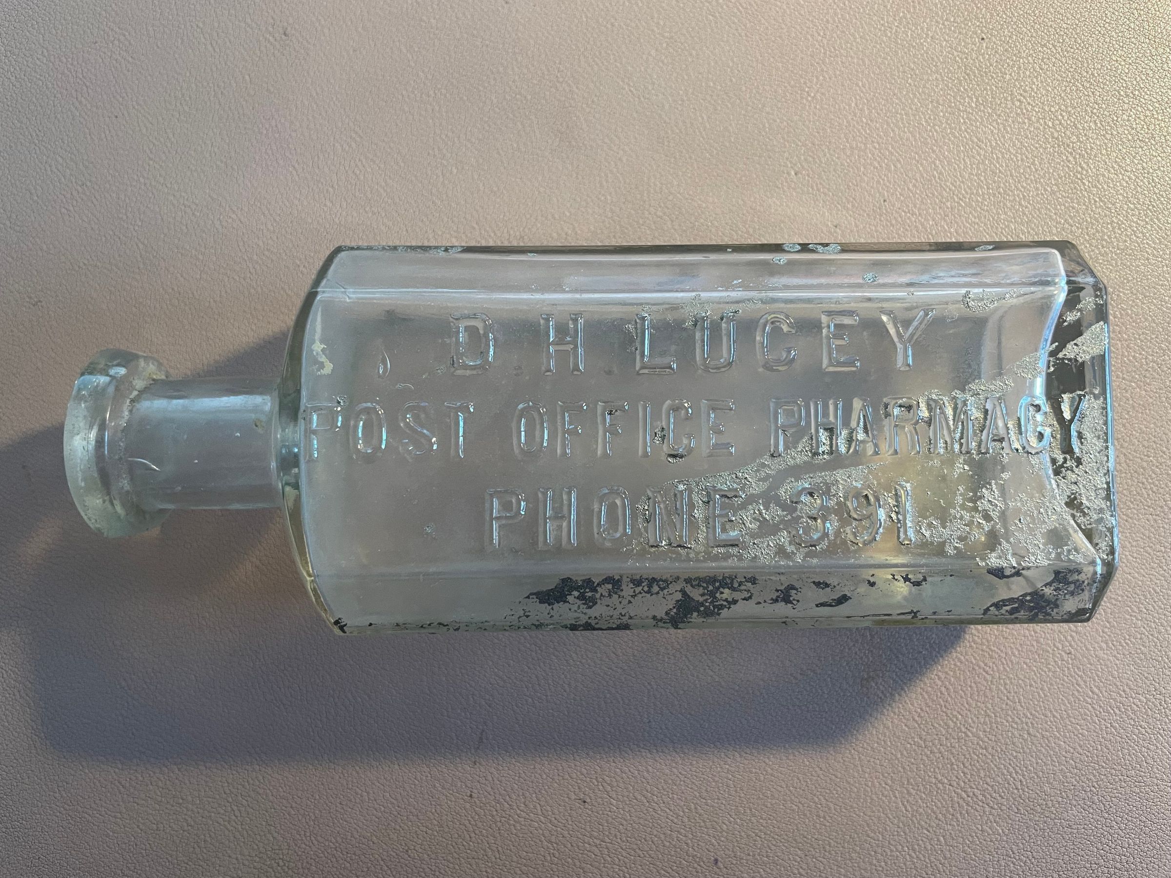Clear glass bottle with raised lettering reading, "D. H. Lucey, Post Office Pharmacy, Phone 391." Bottle has angled corners and wide lipped opening. Has metallic paint splashed on glass.