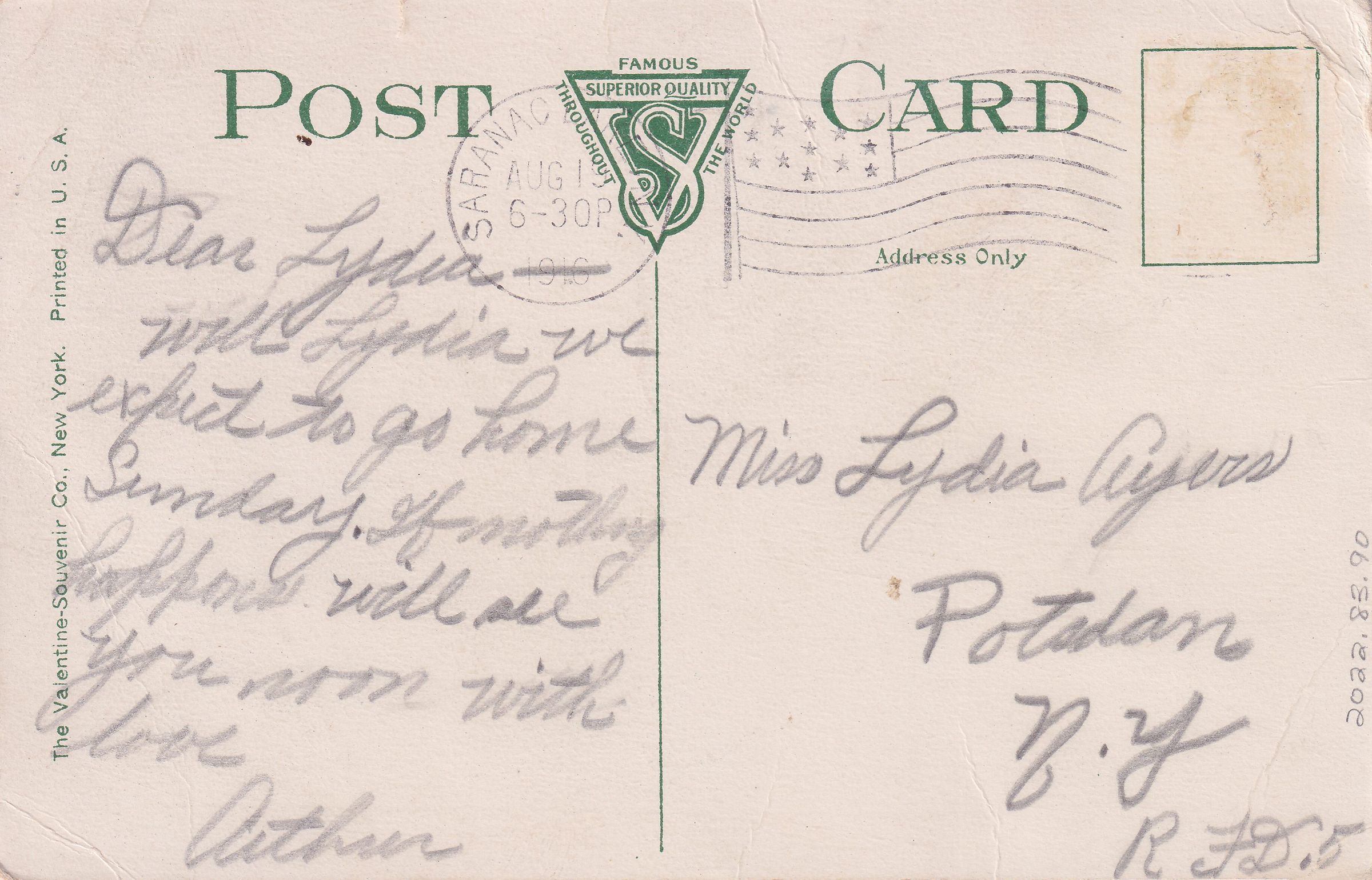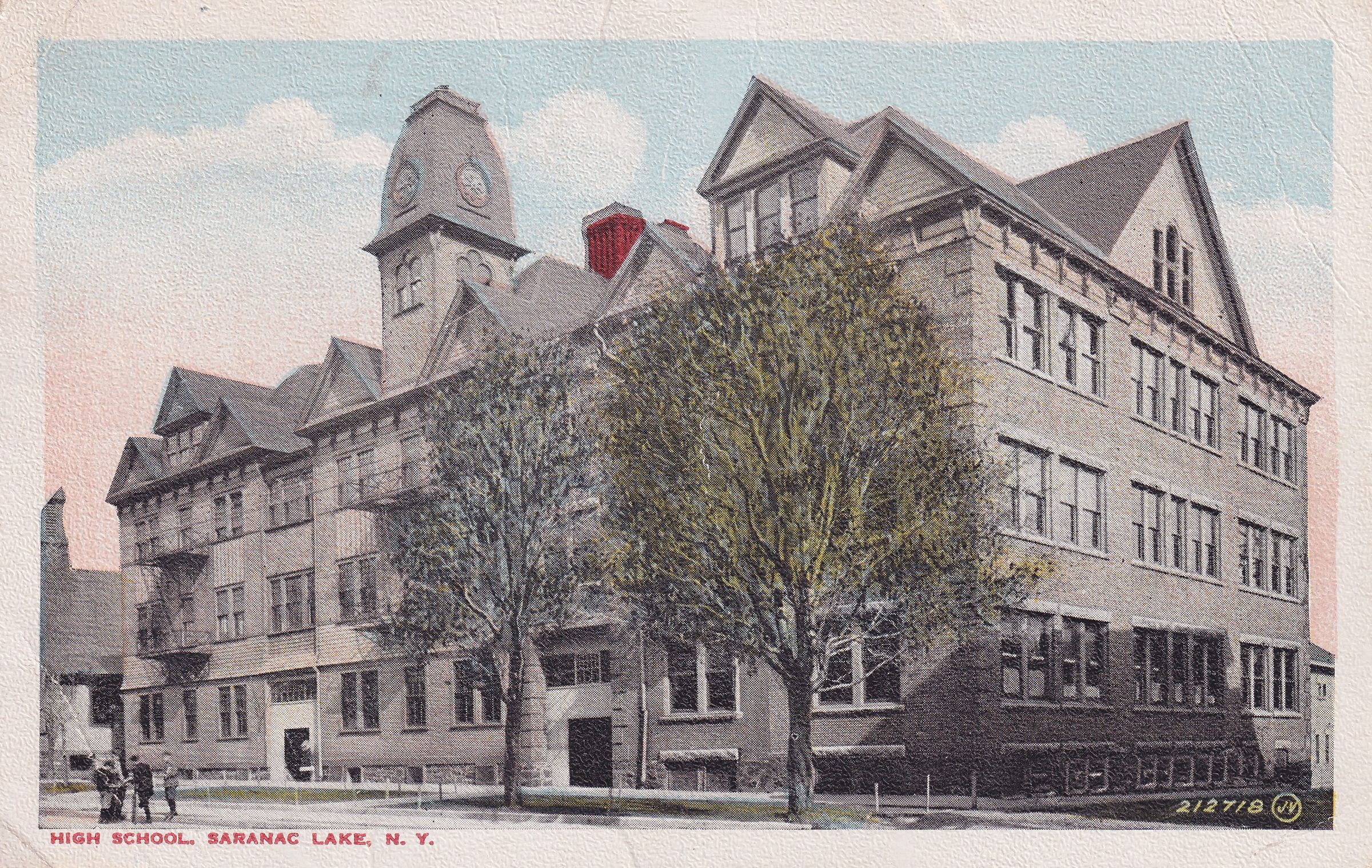 Color postcard showing the original Saranac Lake High School on Main Street. Printed caption on front reads, "High School, Sarnaac Lake, N. Y." Used, divided back, white border, postmarked Saranac Lake, August 19, 1916. Printed by the Valentine-Souvenir Co., New York. Handwritten message on back reads, "Dear Lydia-- Well Lydia we expect to go home Sunday. If nothing happens will see you soon with love. Arthur." Mailed to Miss Lydia Ayers. Potsdam. N.Y. R. F. D. 5.Subject Place