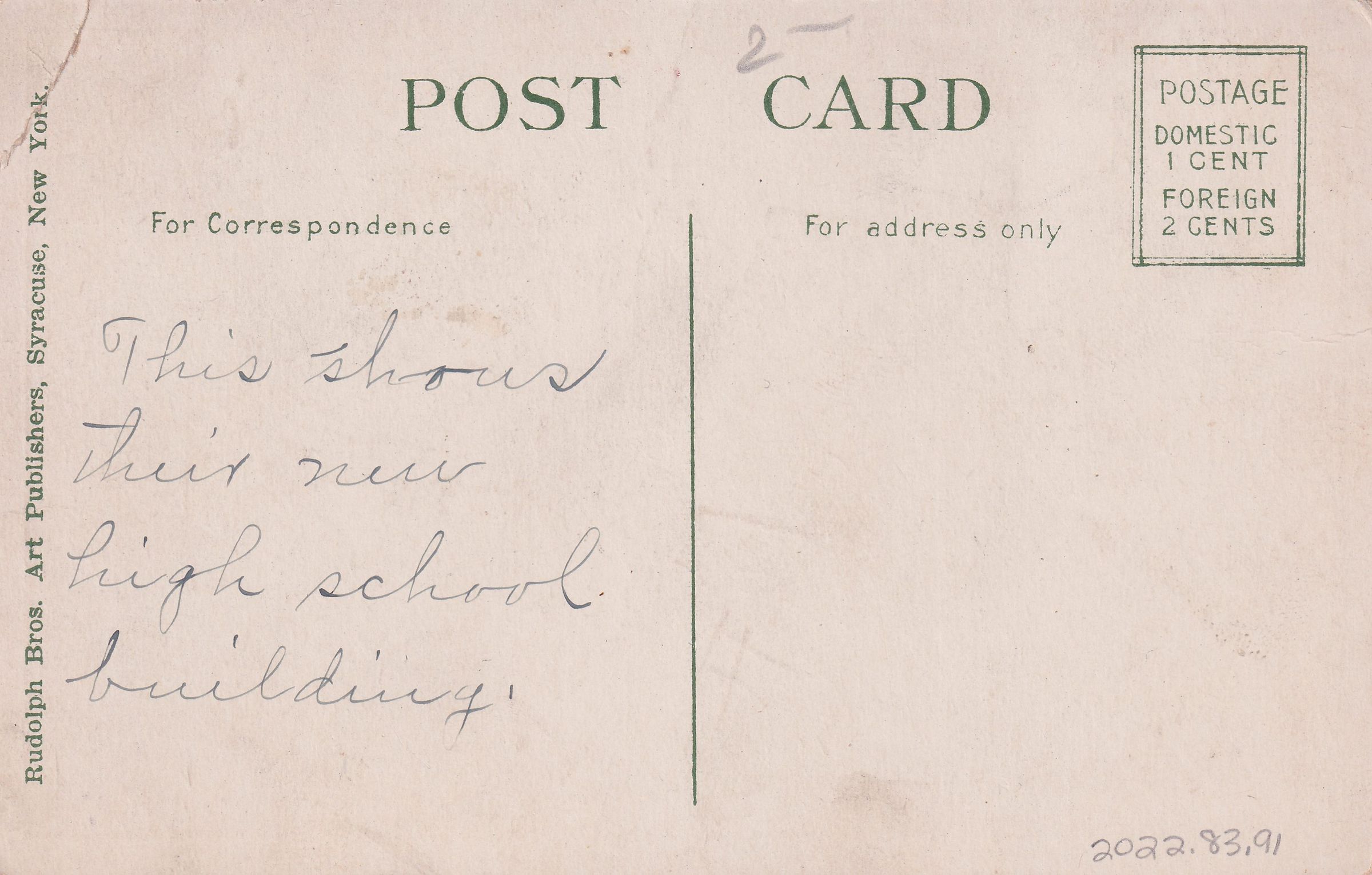Color postcard showing the original Saranac Lake High School on Main Street, looking west. The First United Methodist Church/Odd Fellows Hall is visible just at left. Printed caption on front reads, "Main Street & High School Bldg., looking to Southwest, Saranac Lake, N.Y." Used, divided back, white border, not postmarked. Printed by Rudolph Bros. Art Publishers, Syracuse, New York. Handwritten message on back reads, "This shows their new high school building." No mailing address.Subject Place