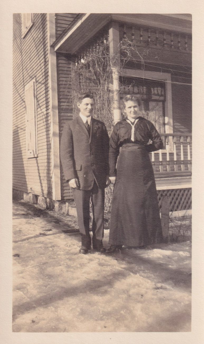 Black-and-White photograph of an unidentified man and woman standing in front of a house. A portion of the front porch is visible behind them. The photograph was likely printed by Kollecker's Kodak and Gift Shop.