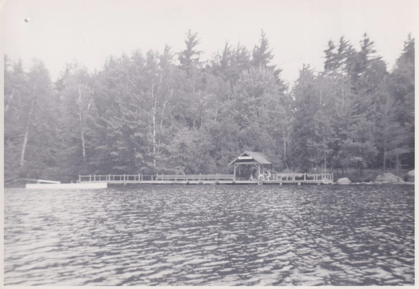 Black-and-White photograph of the large dock at Pyramid Camp (AKA Bartlett Carry Club), seen from the water. Handwritten note on reverse reads, "53."