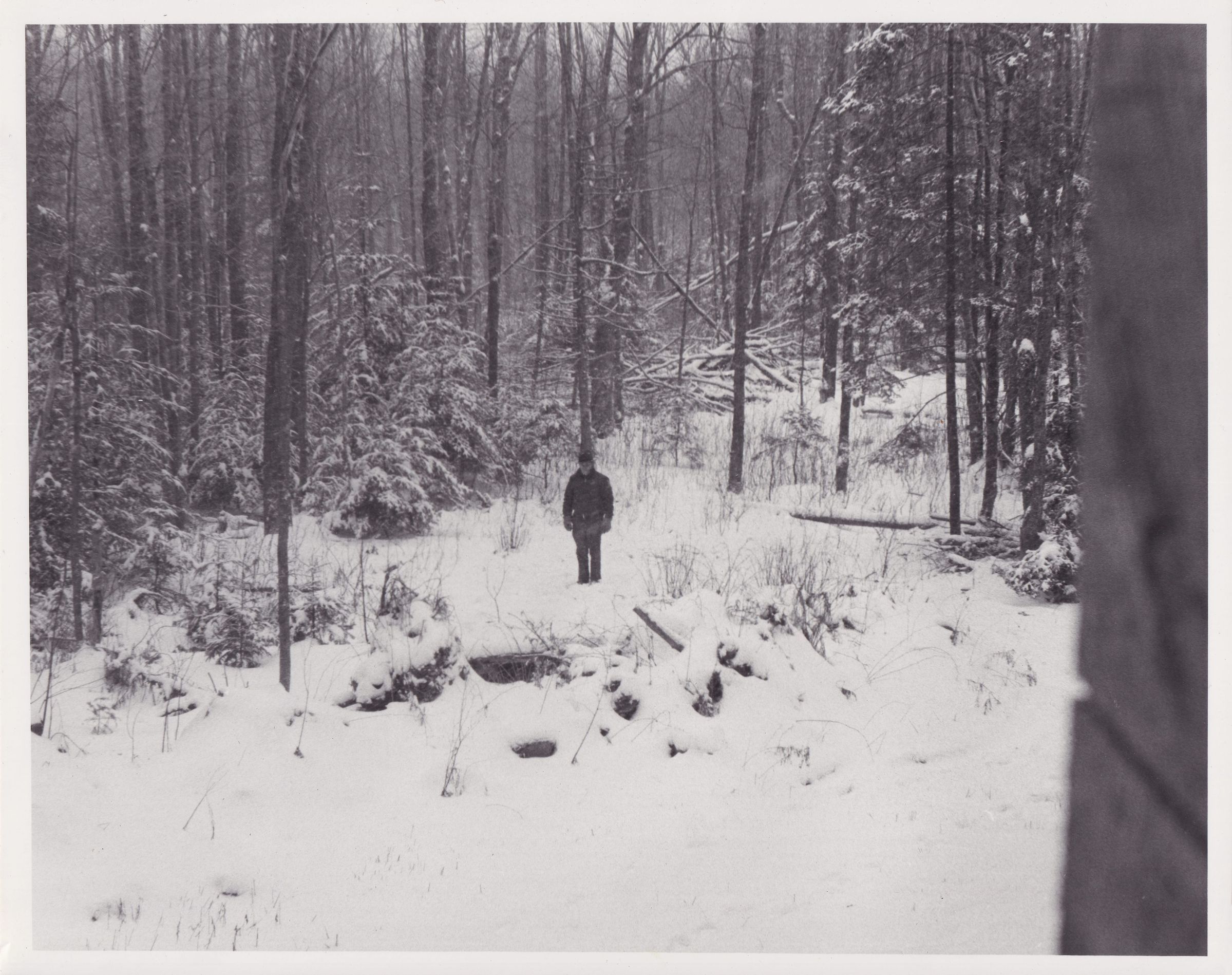 Black-and-White photograph of an elevated view of a man in a game warden uniform standing in the snow. Photograph was likely taken from a hunting blind. Handwritten note on back reads, "#2 11/17/83. F8, 1/60, 12:24PM, taken from top of ladder facing south."Lexicon