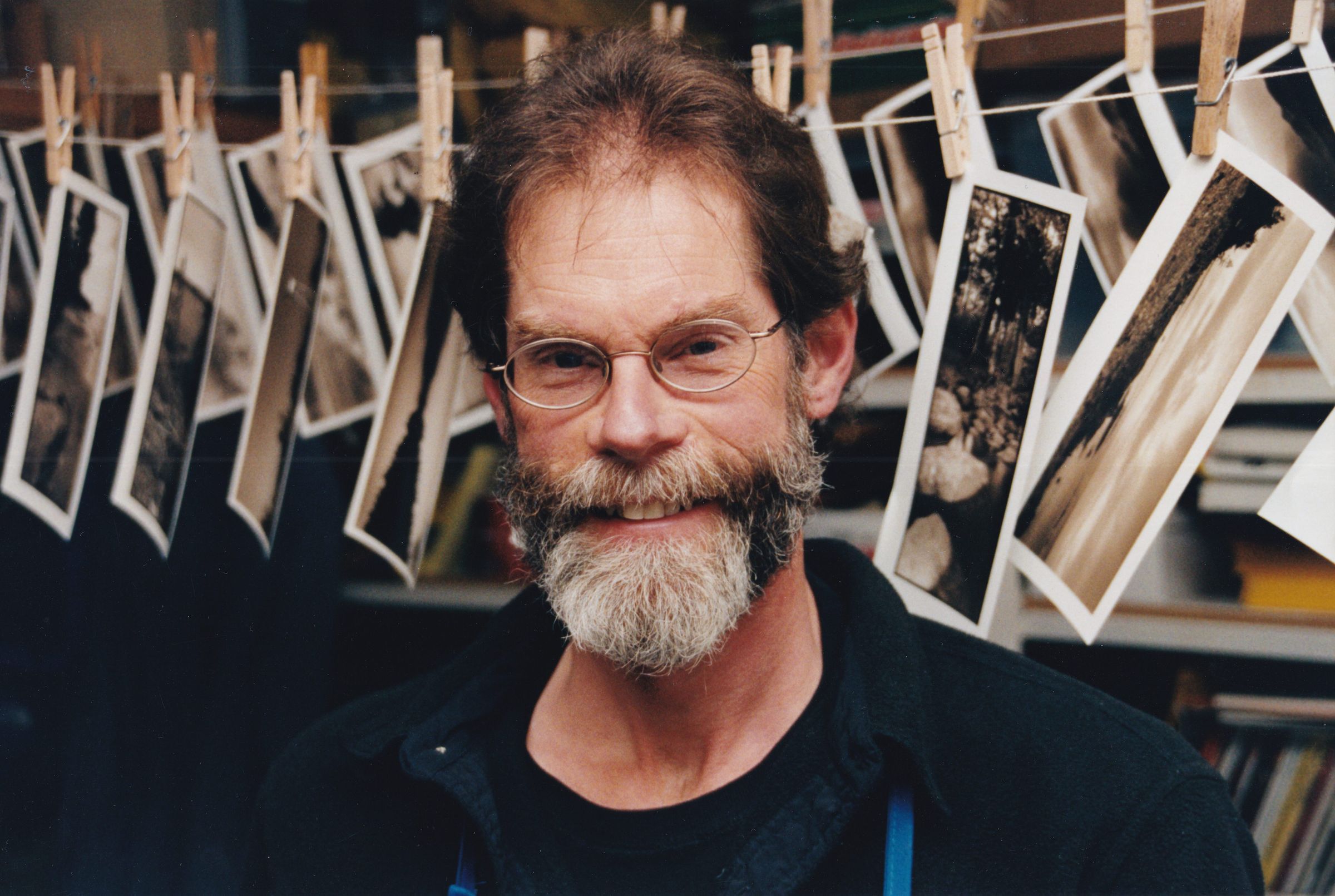 Color photograph of Mark Kurtz in front of a row of drying photographs inside of his business, Mark Kurtz Photography. Portrait taken by Mary Lou Hanpeter Banks as part of her Soul Proprietor exhibition.