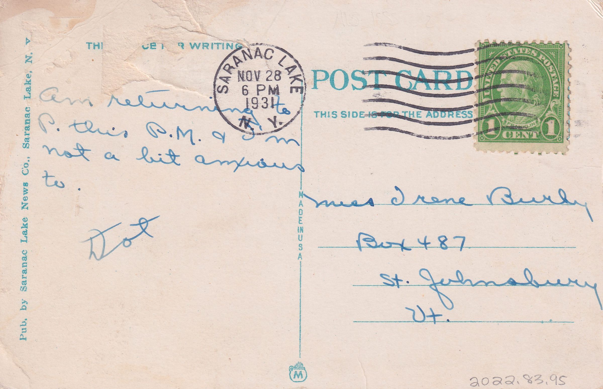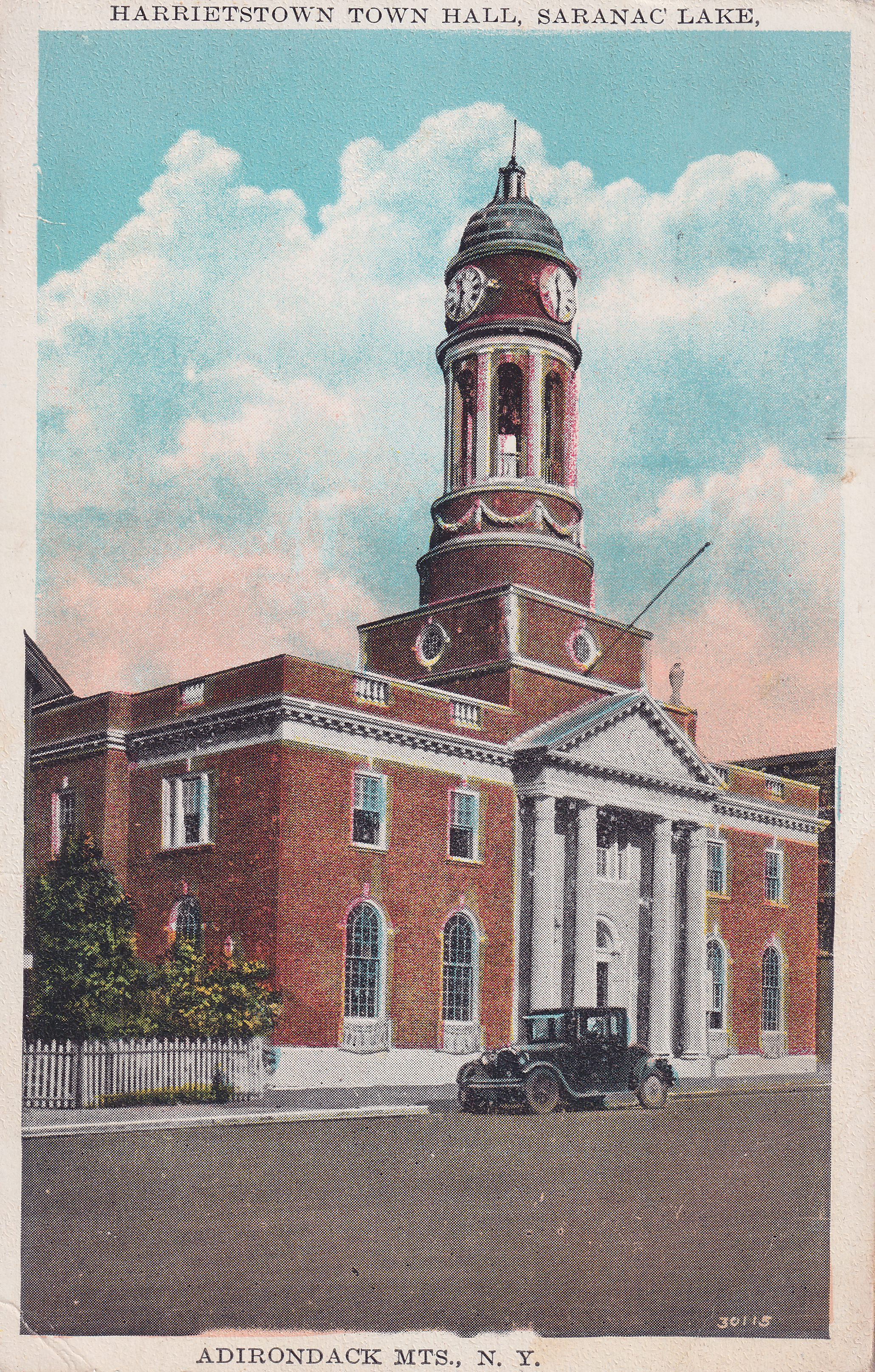 Color postcard showing the second Harrietstown Town Hall. Printed caption on front reads, "Harrietstown Town Hall, Saranac Lake, Adirondack Mts. N.Y." Used, divided back, white border, postmarked Saranac Lake, November 28, 1931. Printed by Saranac Lake News Co., Saranac Lake, NY. Handwritten message on back reads, "Am returning to P. this P.M. & I'm not a bit anxious to. Dot." Mailed to Miss Irene Burly, Box 487, St. Johnsbury, VT.Subject Place