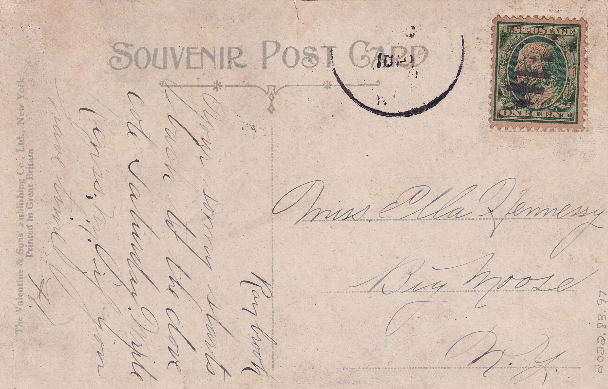 Color postcard showing Reception Hospital/Prescott House. Printed caption on front reads, "Reception Hospital, Saranac Lake, N.Y." Used, divided back, postmark illegible. Printed by the Valentine & Sons' Publishing Co., Ltd., New York. Handwritten message on back reads, "Raybrook. Your sonny starts back to the dovecote Saturday. Write Renss. NY if you have time. H." Mailed to Miss Ella Hennessy, Big Moose, N.Y.Subject Place