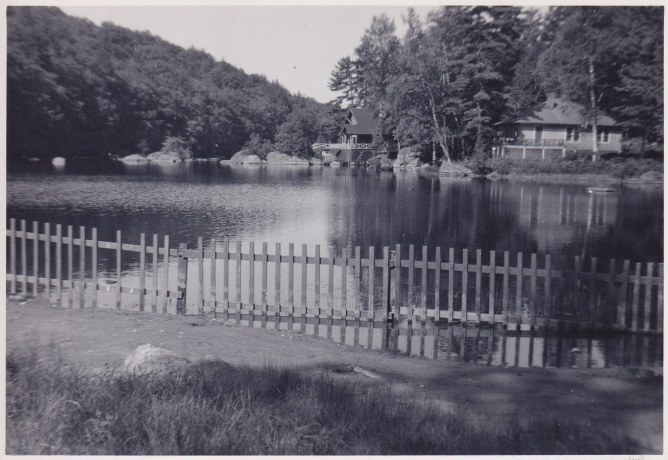 Black-and-White photograph of a fence along a body of water. Two cottages at Pyramid Camp (AKA Bartlett Carry Club) can be seen on the opposite shore. Handwritten caption on reverse reads, "Merritt & Spruce. 52."
