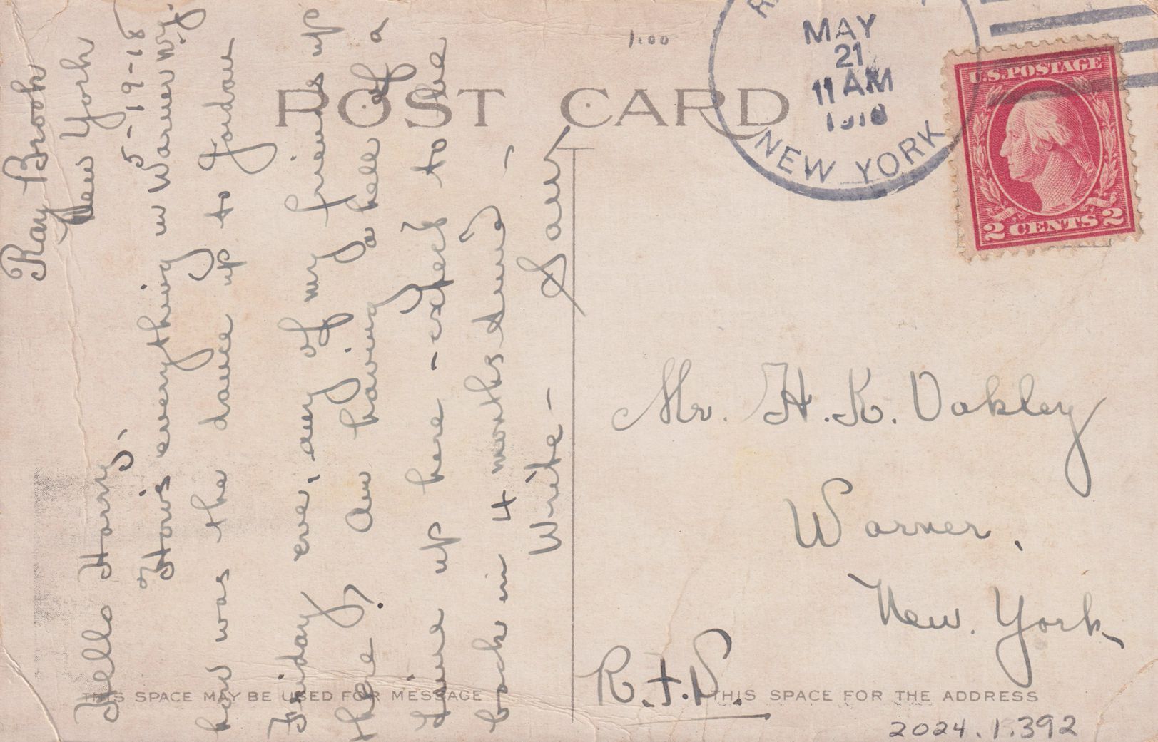 Postcard with an illustration of the boat house at the Ampersand Golf Club. The postcard is addressed to Mr. H. R. Dabley.