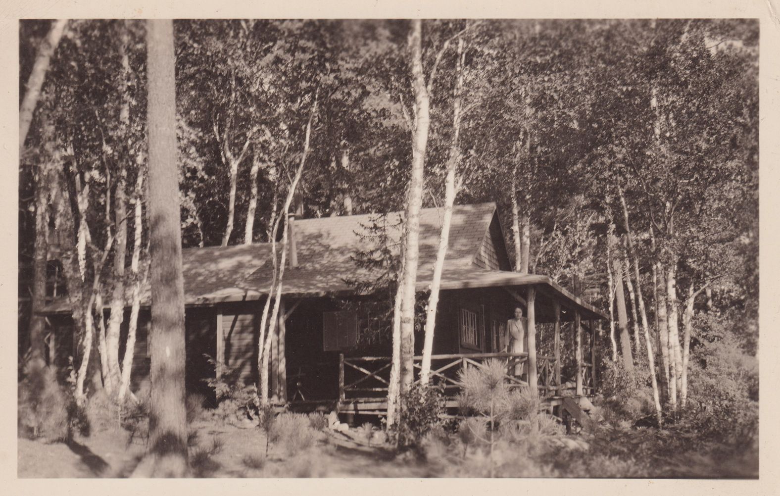 Black-and-White photograph postcard showing a small cabin/camp seen through the woods. A woman is standing on the porch. No photographer's mark. Used, divided back, white border, postmarked Saranac Inn, July 9, 1945.