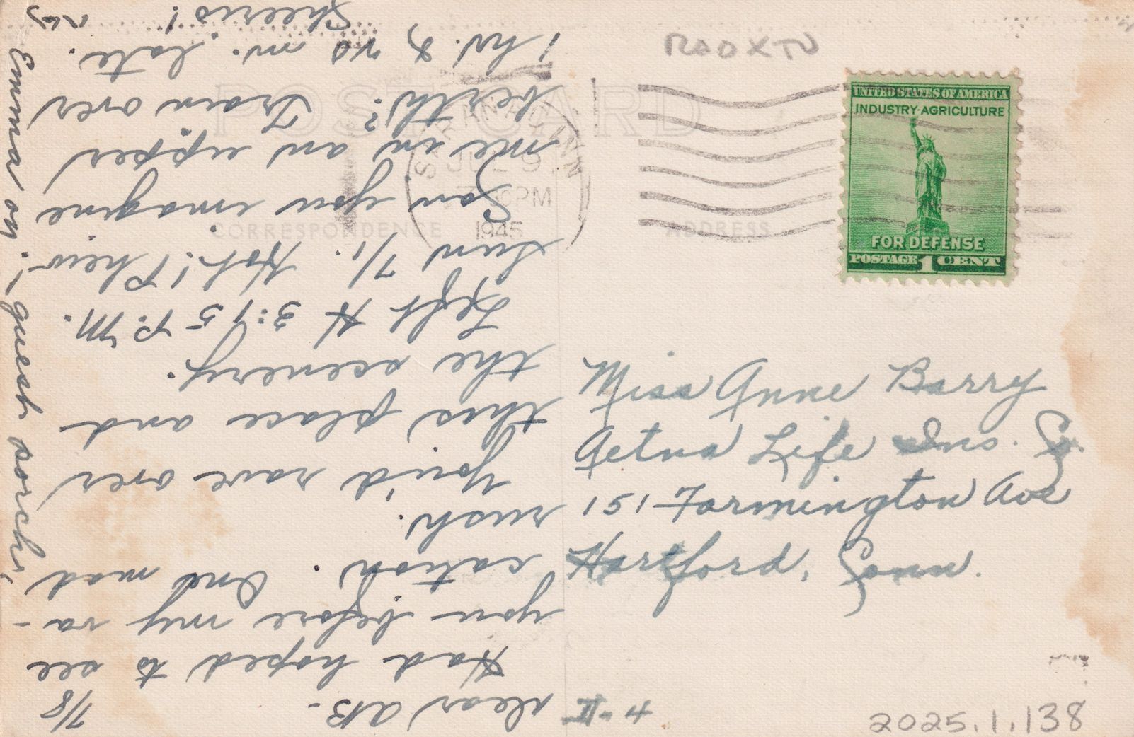Handwritten message on reverse reads, "7/8. Dear AB - Had hoped to see you before my vacation. One mad rush. You'd rave over this place and the scenery. Left H 3:15 P. M. Sun 7/1. Hot! Phew! Can you imagine me in an upper berth? Train over 1h & 20 m. late. Cheerio! [?] Emma on guest porch." Mailed to Miss Agnes Barry, Aetna Life Ins. Co., 151 Farmington Ave., Hartford, Conn.Collection