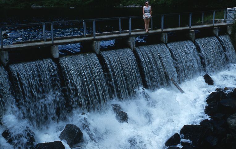 Color Kodachrome slide showing a woman standing at the top of a spillway on an unidentified dam. Handwritten caption on front reads, "Gma Waterfalls - Adirondacks." From a group of vacation slides taken by an unidentified family.