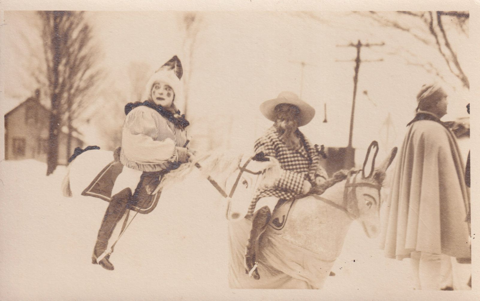 Postcard with a Kollecker photograph of two individuals on a fake horse and donkey. One person is dressed as a clown and the other as a farmer.