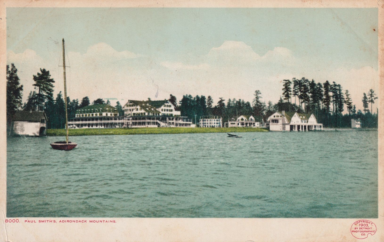 Color postcard showing Paul Smith's Hotel, seen from Lower St. Regis Lake. Printed caption on front reads, "Paul Smith's, Adirondack Mountains." Printed by the Detroit Photographic Co.. Used, divided back, white border, postmarked Bay Pond, NY, July 15, 1909.
