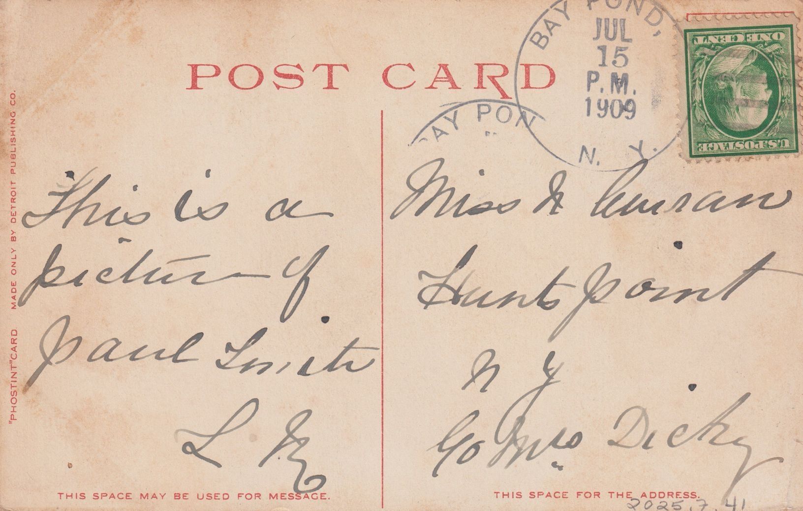 Handwritten message on reverse reads, "This is a picture of Paul Smith. L. K. [?]" Mailed to Miss N. [?], Hunts Point, NY, c/o Mrs. Dietz.Subject Place