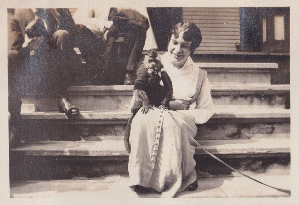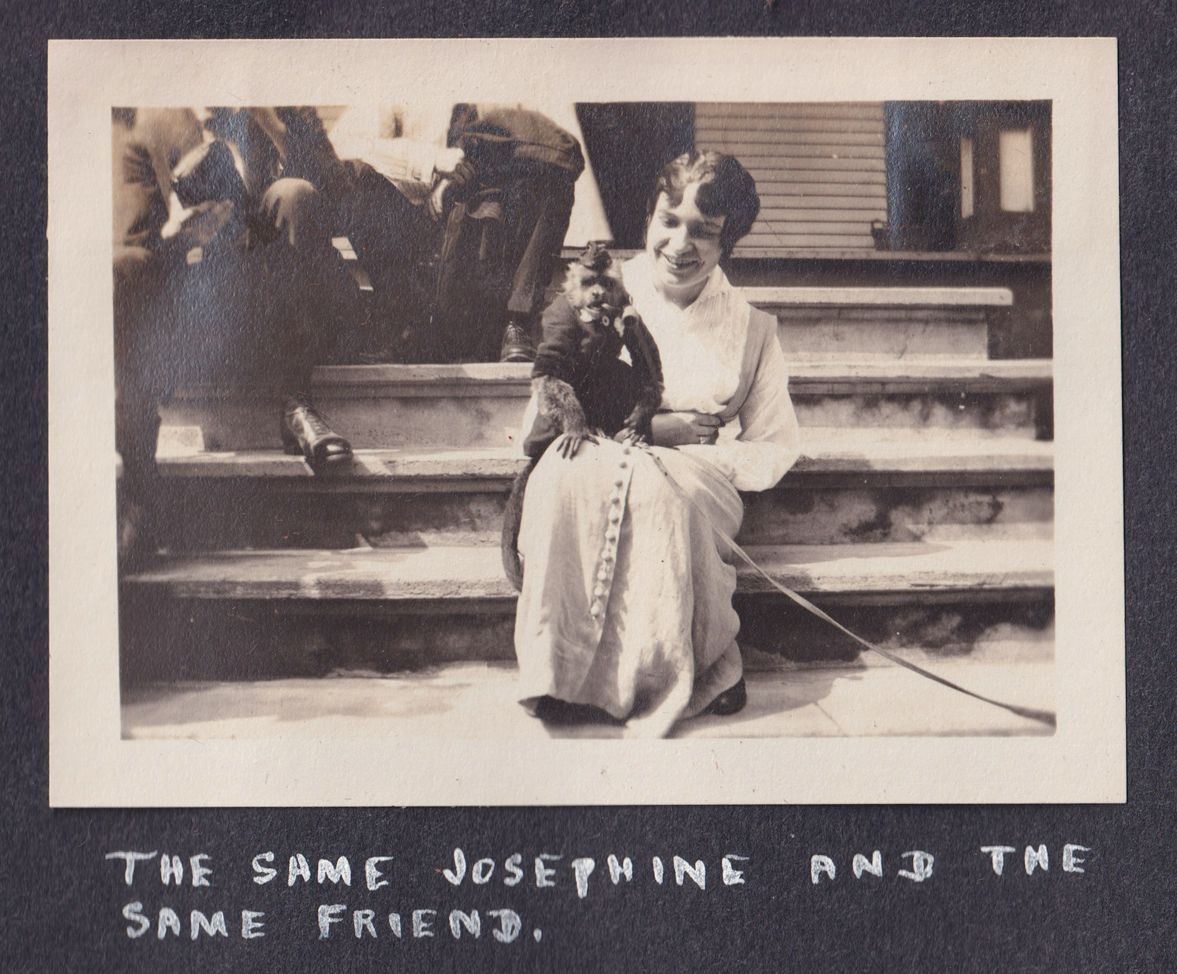 Black and white photograph of a woman with a small monkey sitting on her lap. The monkey is wearing a jacket and cap. They are seated on steps leading up to a house and there are unknown people behind them. Beneath the photo is the caption, "Josephine McMartin of Johnstown, N.Y. and a Friend."