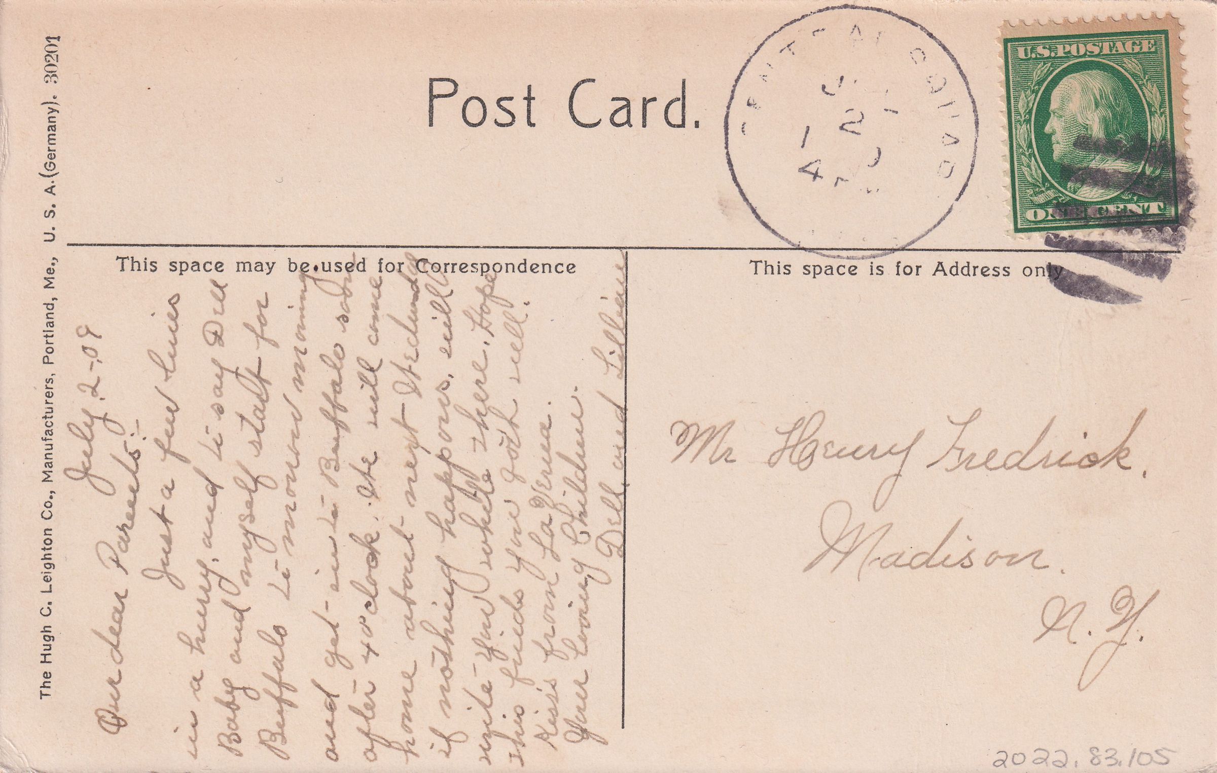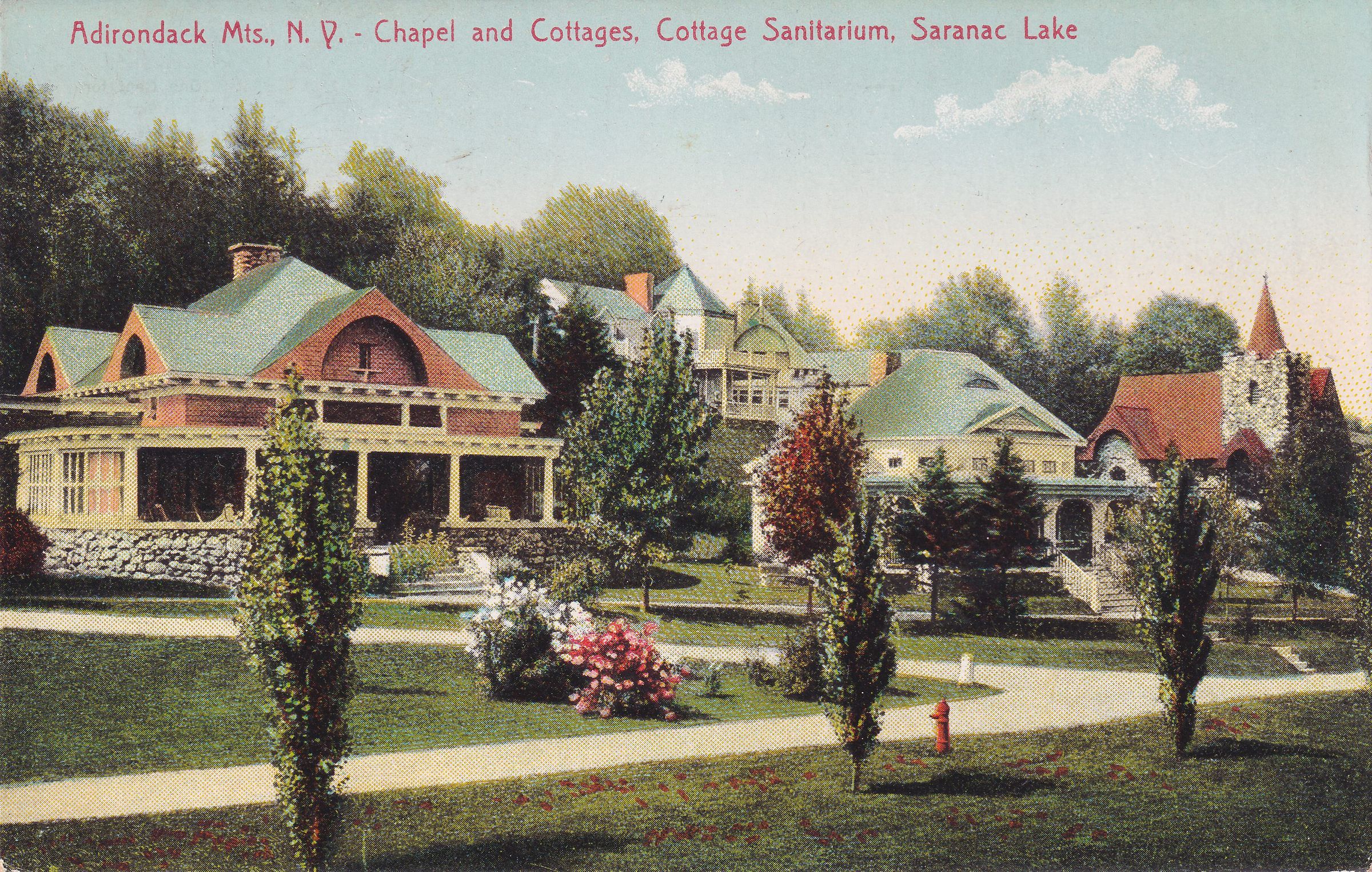 Color postcard showing Ladd Cottage, Anderson Cottage, and Baker Memorial Chapel at the Adirondack Cottage Sanitarium (later renamed Trudeau Sanatorium). Printed caption on front reads, "Adirondack Mts. N.Y. Chapel and Cottages, Cottage Sanitarium, Saranac Lake." Printed by the Hugh C. Leighton C., Portland, ME. Used, divided back, postmarked Central Square, [?], July 2 [rest is illegible]. Handwritten message on back reads, "July 2, -09. Our dear Parents:- Just a few lines in a hurry, and to say Dell Baby and myself start for Buffalo tomorrow morning and get into Buffalo soon after 4:00 o'clock. We will come home about next Wednesday if nothing happens. Will write you while there. Hope this finds you both well. Kiss's from La Vercea [?]. Your loving children. Dell and Lillian." Mailed to Mr. Henry Fredrick, Madison, N.Y.Subject Place