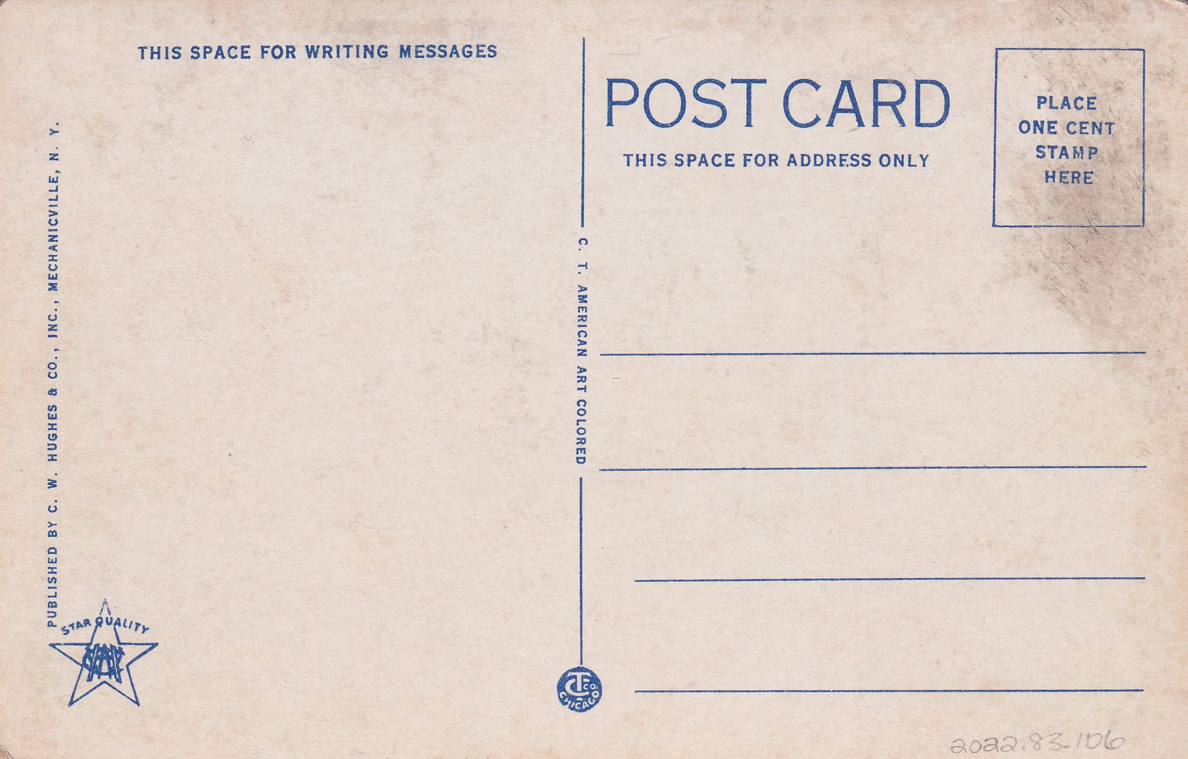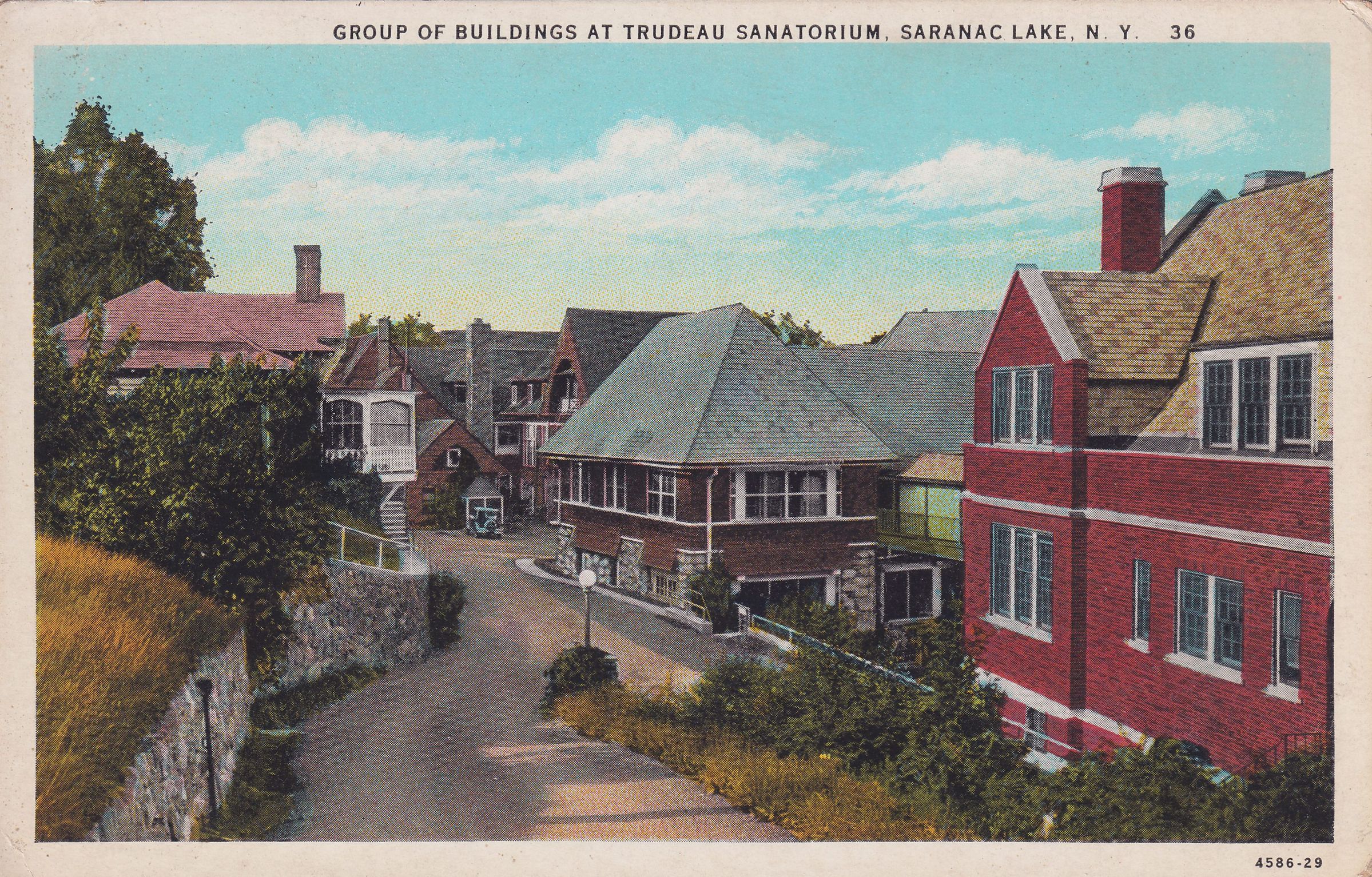 Color postcard showing the back sides of the Laboratory and Medical and Reception Building at Trudeau Sanatorium. The porch of Hoffman Cottage can be seen along with portions of the Service Building and Administration Building. Printed caption on front reads, "Group of Buildings at Trudeau Sanatorium, Saranac Lake, N. Y." Printed by C. W. Hughes & Co., Inc., Mechanicville, NY. Unused, divided back, white border.Subject Place