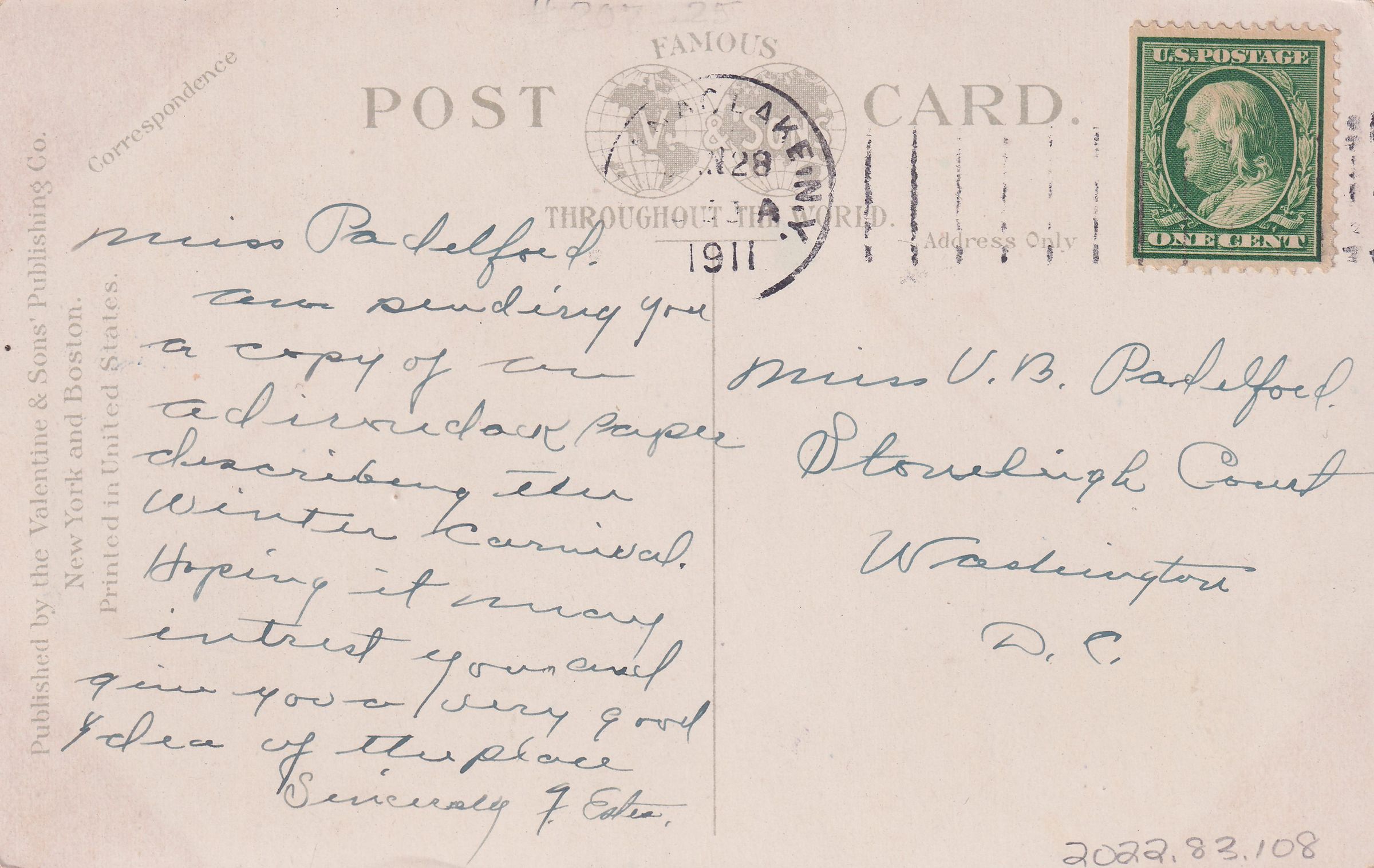 Color postcard showing a view down Church Street, looking north. The First Presbyterian Church of Saranac Lake is visible at left. Printed caption on front reads, "Church Street, Saranac Lake, N. Y." Printed by the Valentine & Sons' Publishing Co., New York. Used, divided back, postmarked Saranac Lake, NY, January 28, 1911. Handwritten message on back reads, "Miss Parleford. Am sending you a copy of our Adirondack paper describing the Winter Carnival. Hoping it may interest you and give you a very good idea of the place. Sincerely, F. Estes." Mailed to Miss V. B. Parleford, Stoneleigh Court, Washington, D. C.Subject Place