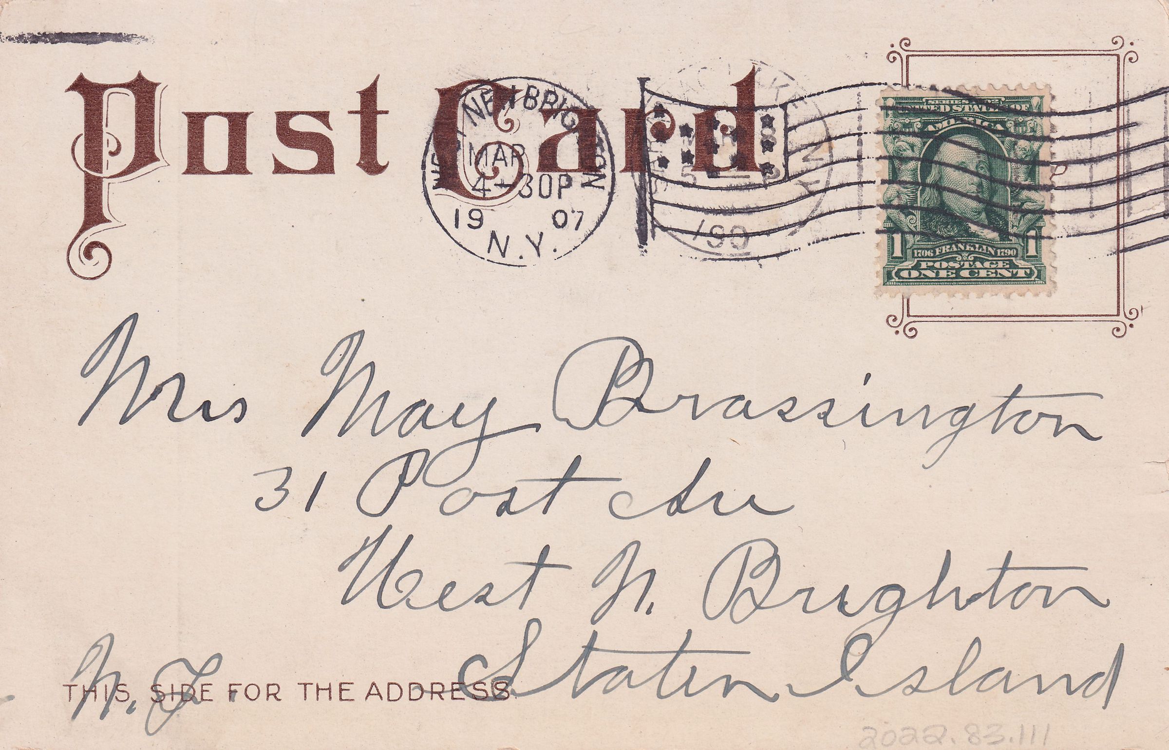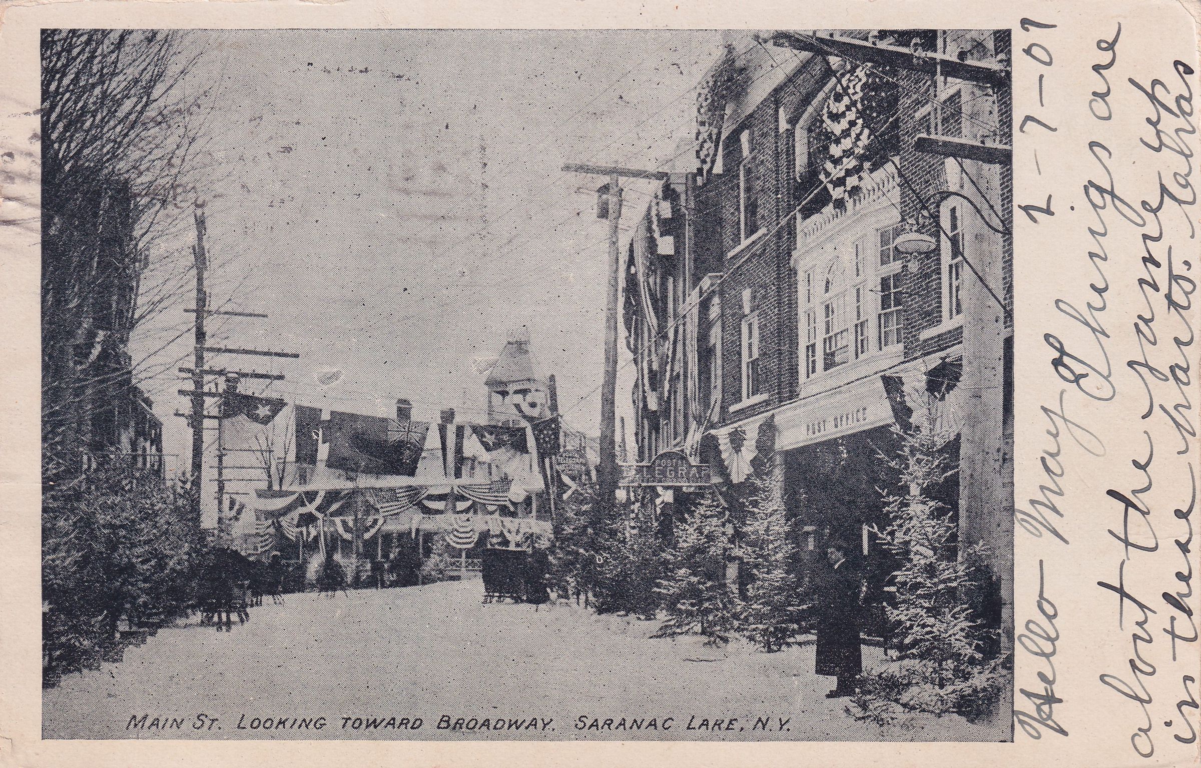 Black-and-white postcard showing the view north along Main Street. Buildings are visible along Main Street, with the Berkeley House at center. The buildings are all decorated with bunting, and Christmas trees line the street, likely for Winter Carnival. Printed caption on front reads, "Main St. Looking Toward Broadway, Saranac Lake, N. Y." No printers' mark. Used, divided back, white border, postmarked March 9, 1907. Handwritten message on front reads, "2-7-07. Hello May, Things are about the same up in these parts. [Chas?]" Mailed to Mrs. May Brassington, 31 Post Su. West N. Brighton, Staten Island, NY.Subject Place