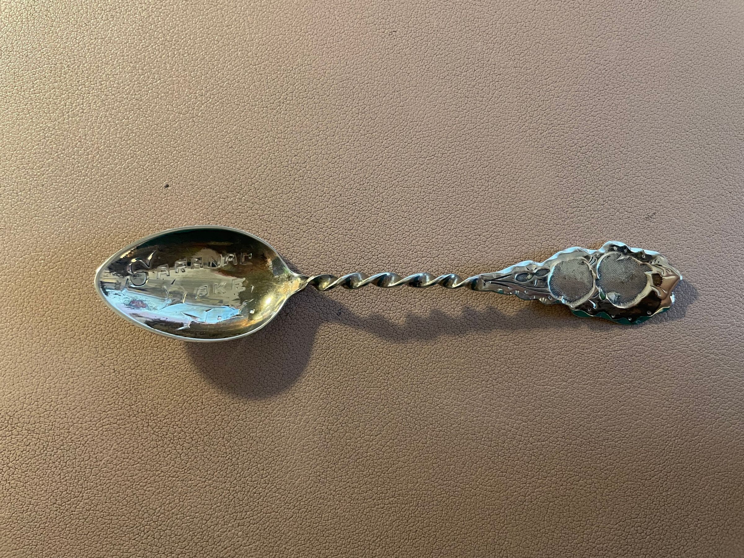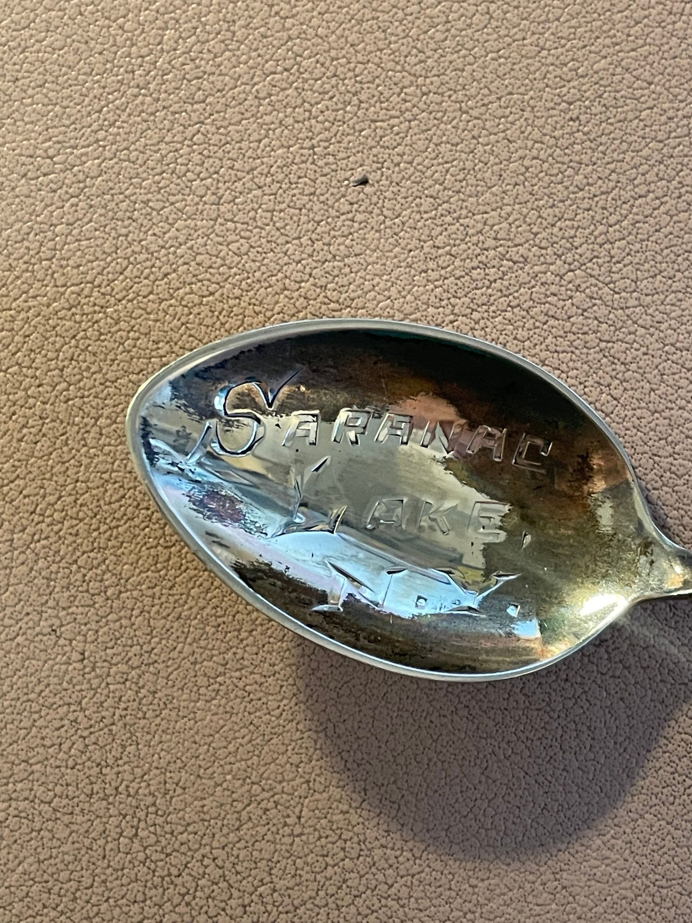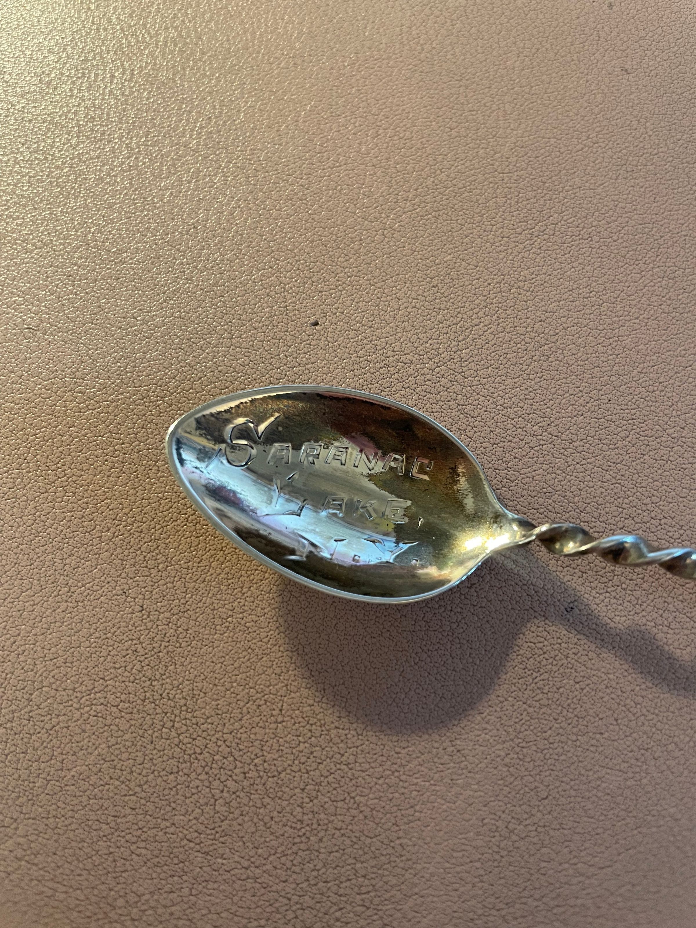 Sterling silver souvenir spoon with "Saranac Lake, N.Y." engraved in the bowl. With spiral handle. Handle appears to have had an enameled/painted design that has worn off.